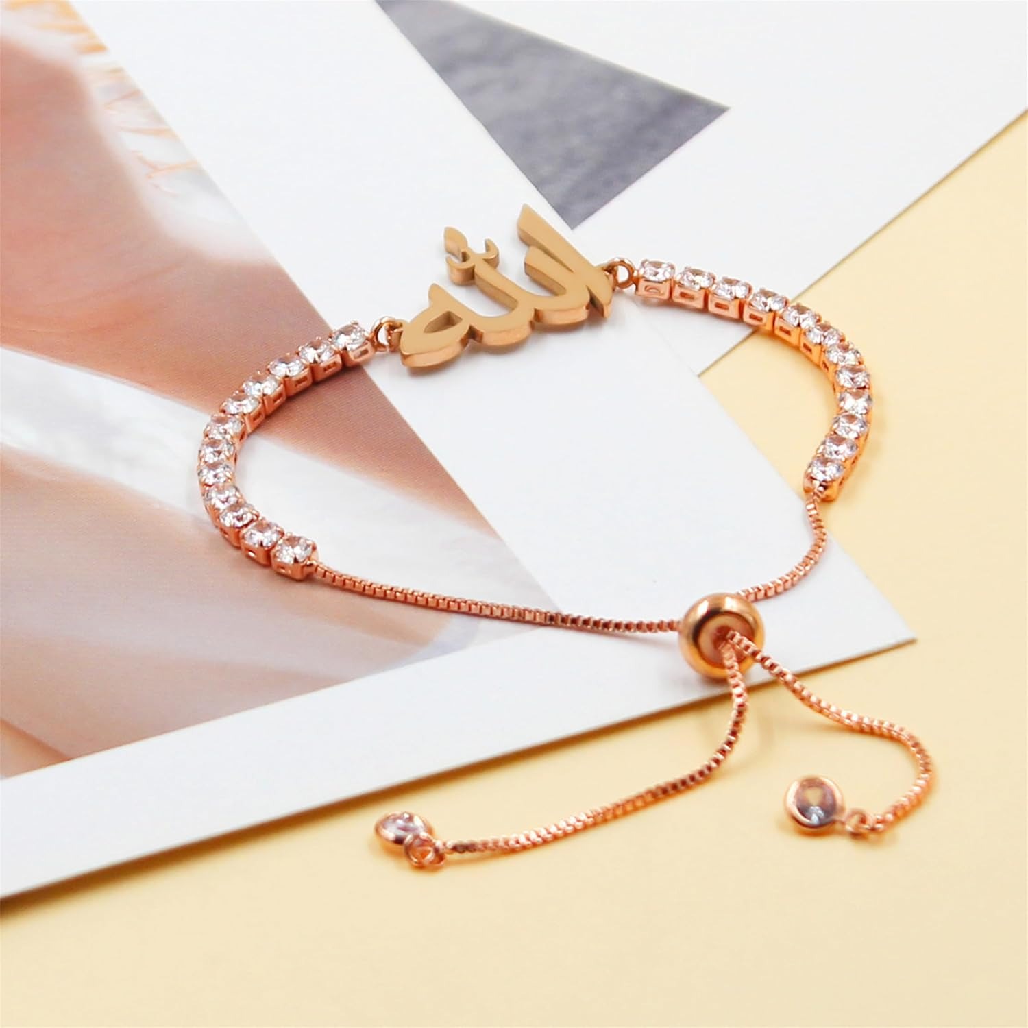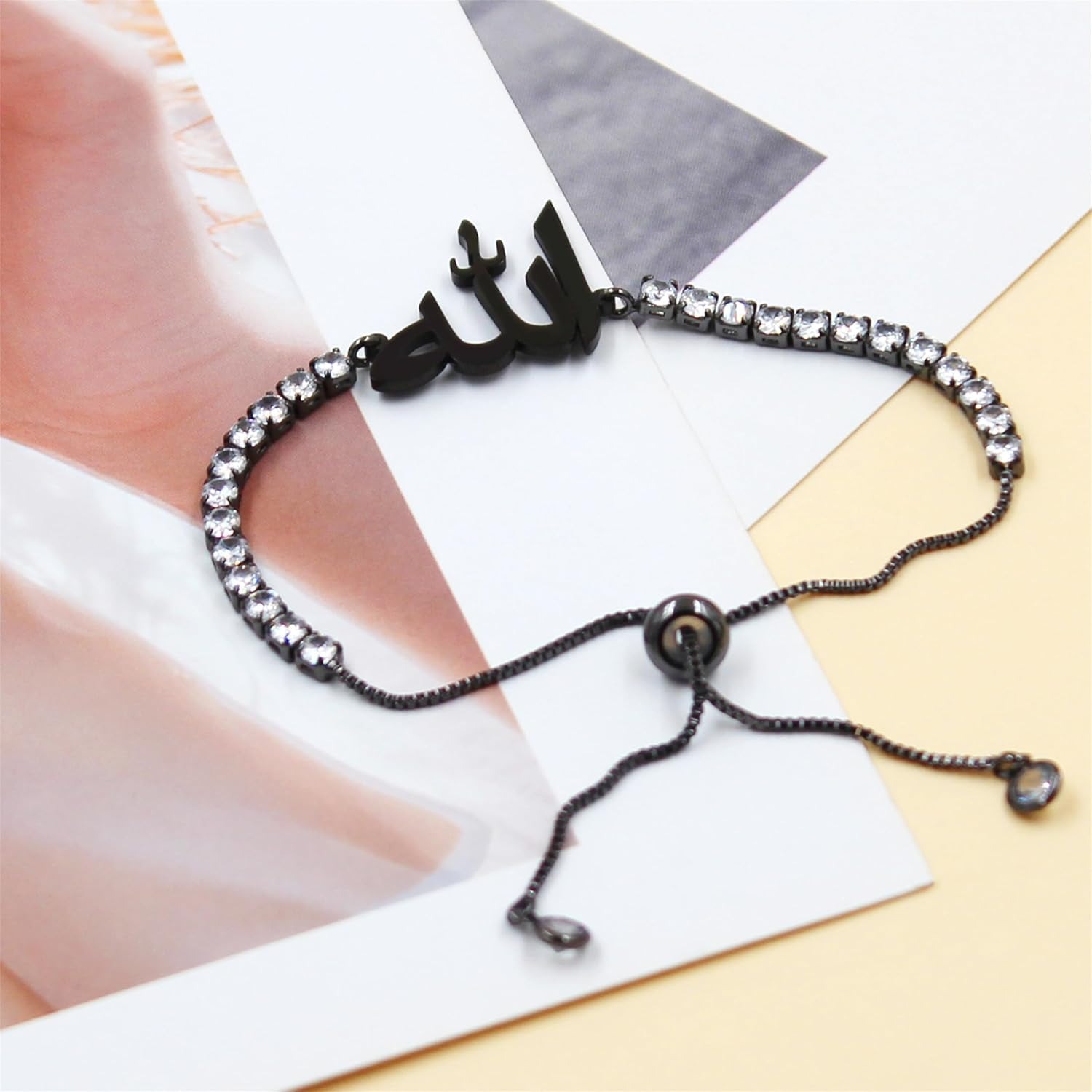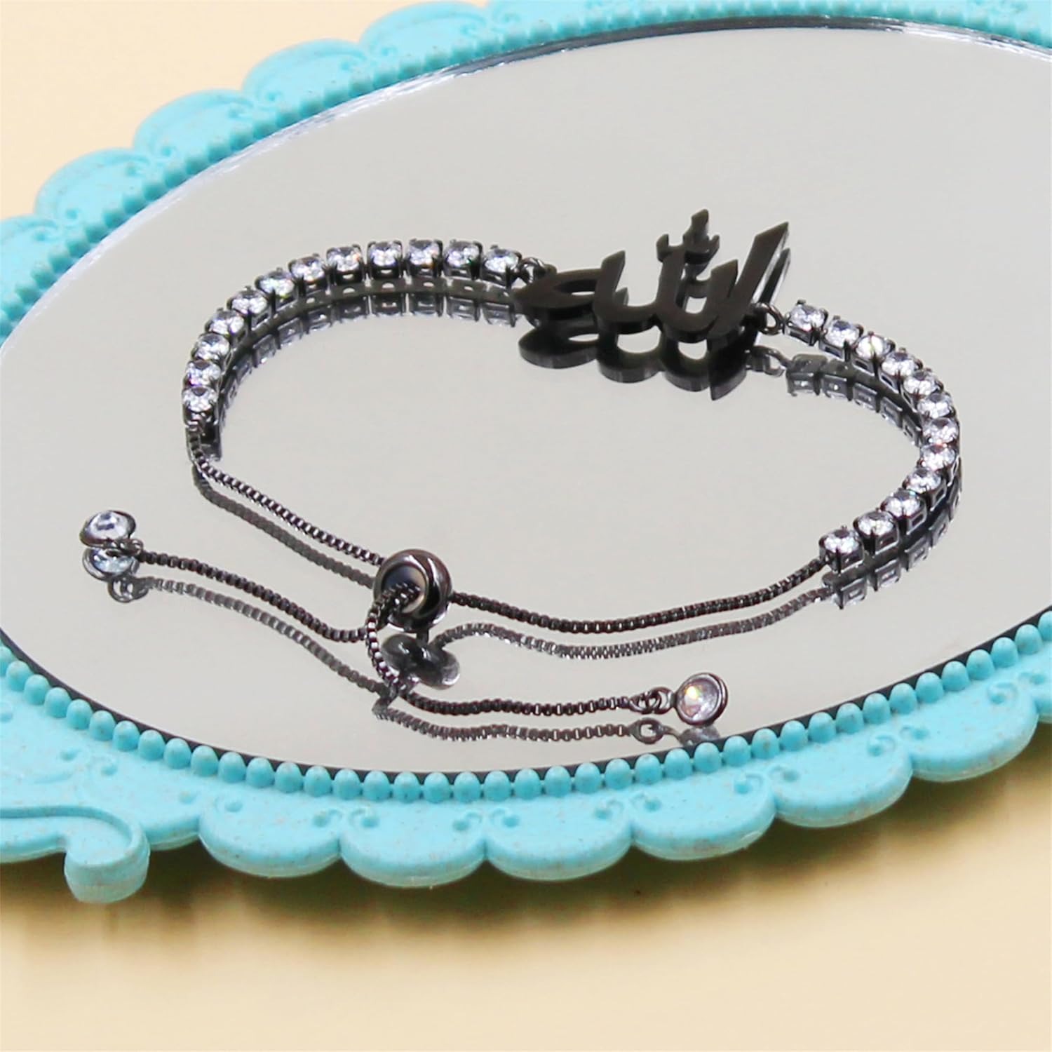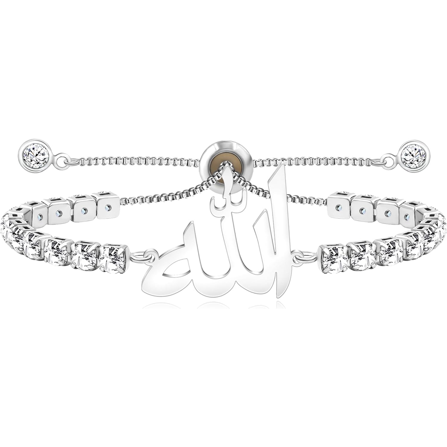This sparkling tennis bracelet features a beautifully crafted Arabic “Allah” script charm, symbolizing faith, gratitude, and spiritual strength. The flowing Arabic calligraphy blends seamlessly with a classic CZ tennis bracelet, creating a meaningful yet elegant piece for everyday wear or special occasions.
