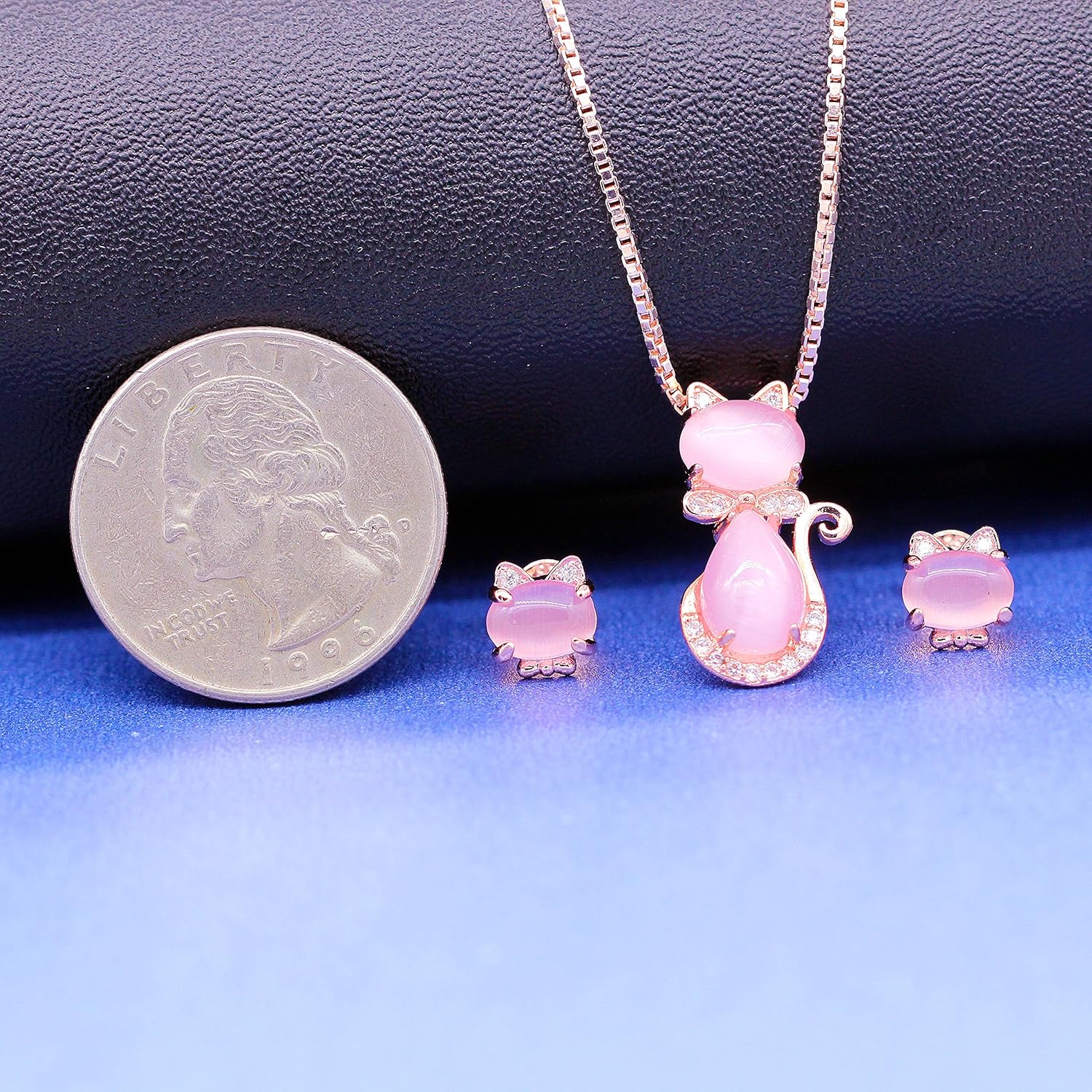 This adorable cat jewelry set features a glowing pink cat eye stone paired with sparkling cubic zirconia accents. Designed with cute cat ears, a bow, and a curled tail, it’s the perfect jewelry set for cat lovers.