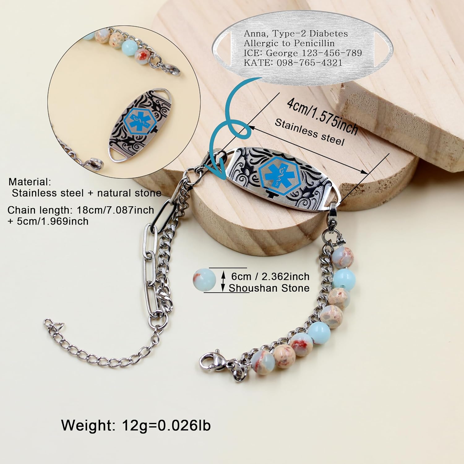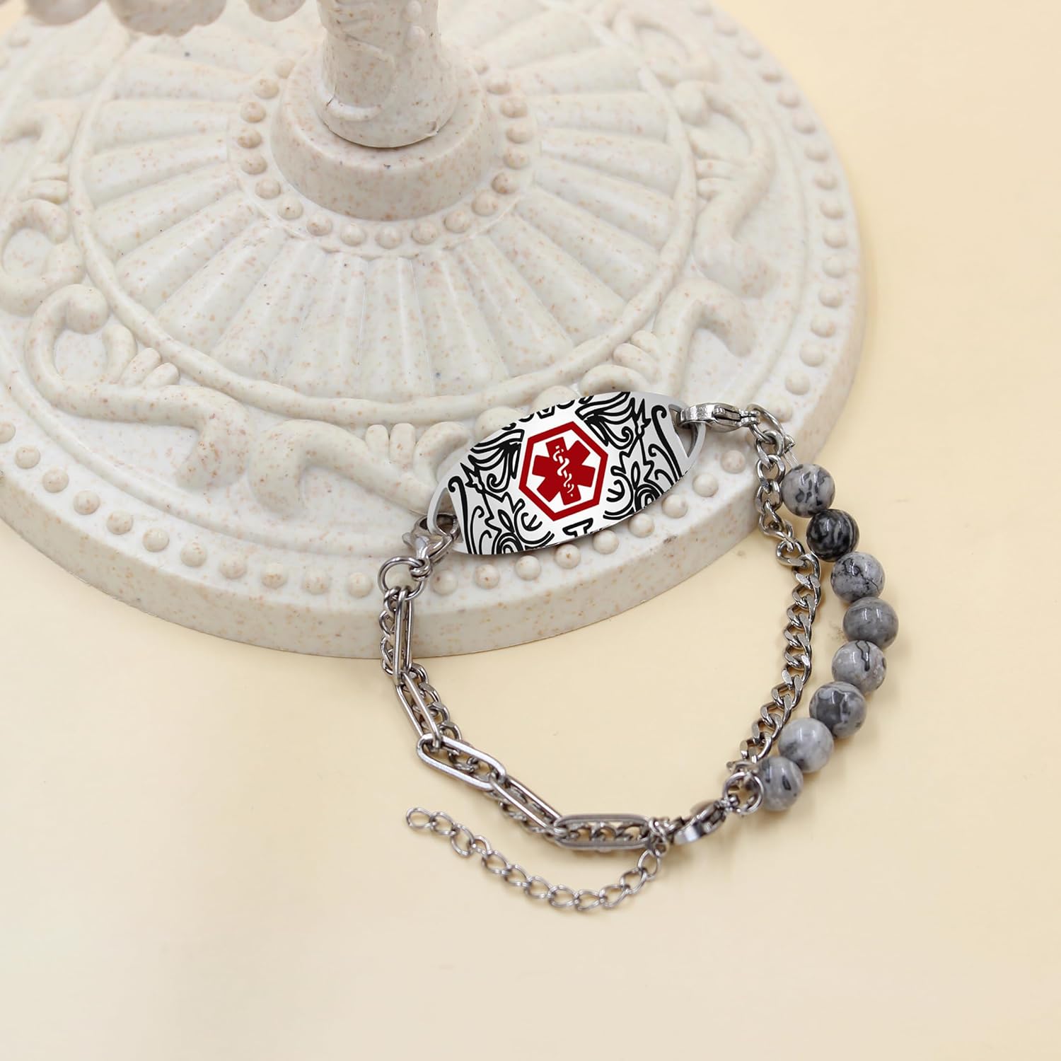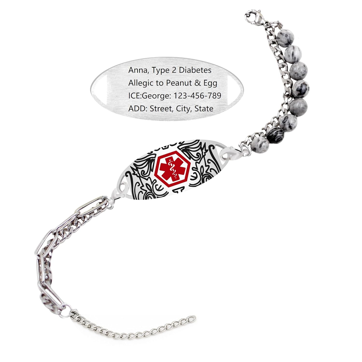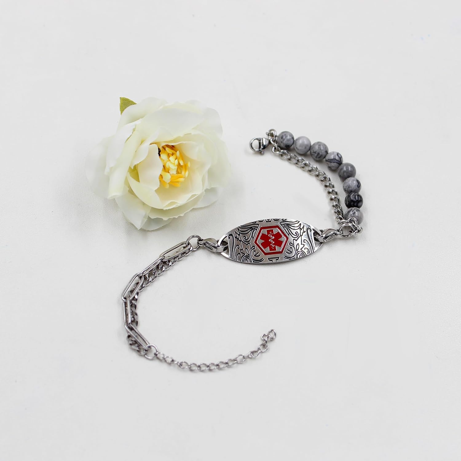 Customized Engraving Bracelet, Grey Map Jasper, Double-Strand Medical ID Jewelry, Interchangeable Lobster Clasp, Stainless Steel Medical Alert Tag, EMS Symbol Bracelet for Seniors, Caduceus Medical Emergency Jewelry, Allergy ID Tag, First Aid Wristband, 17–22cm, Health Card Included.