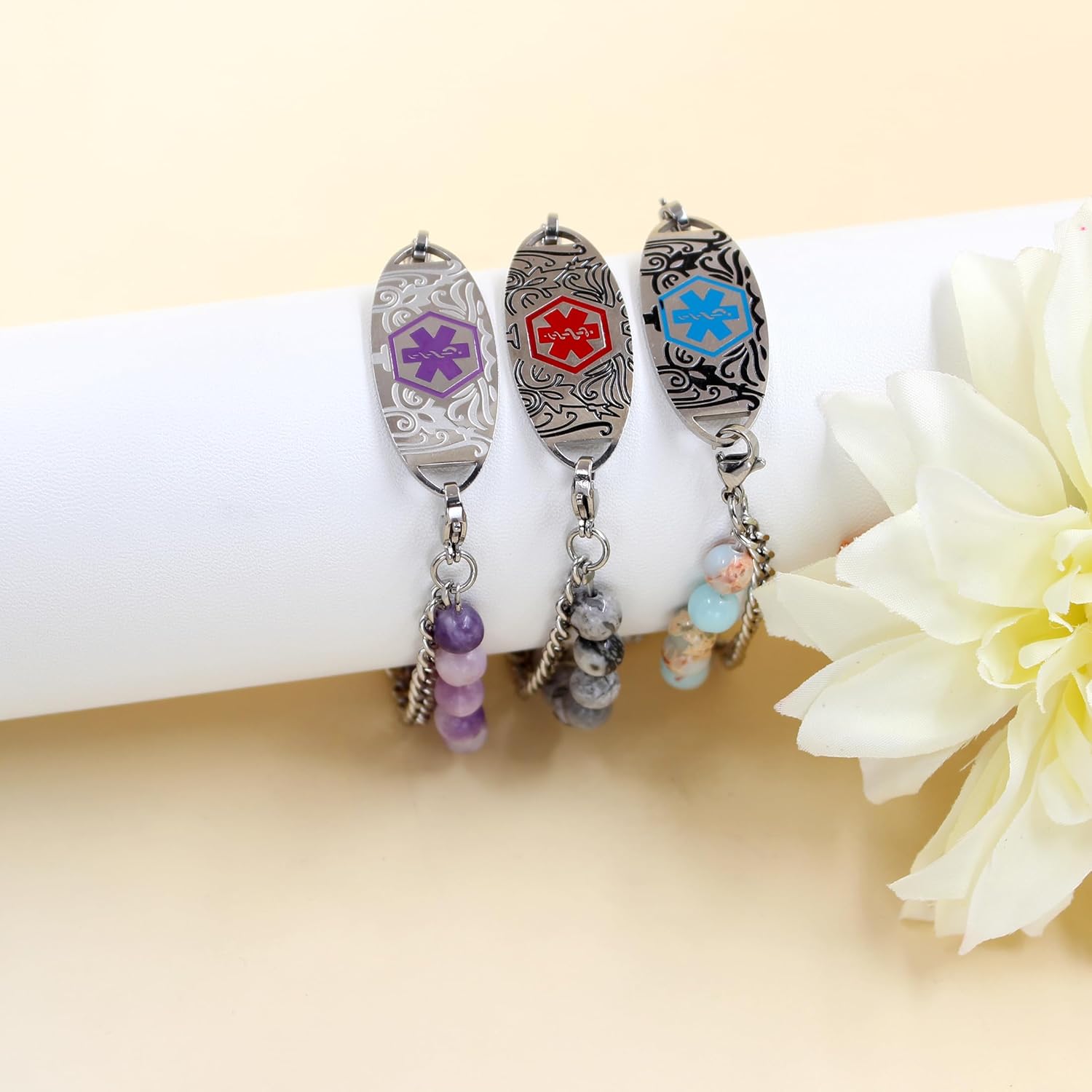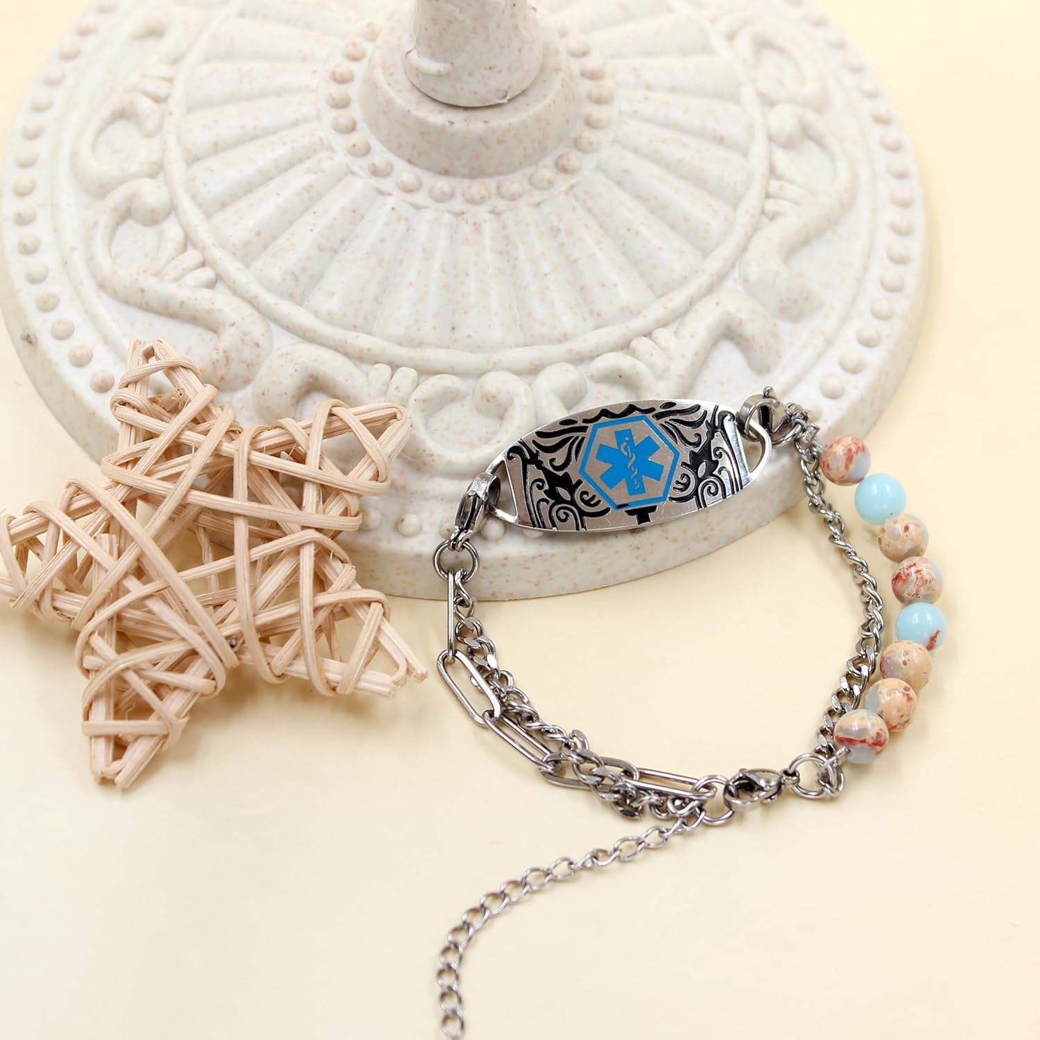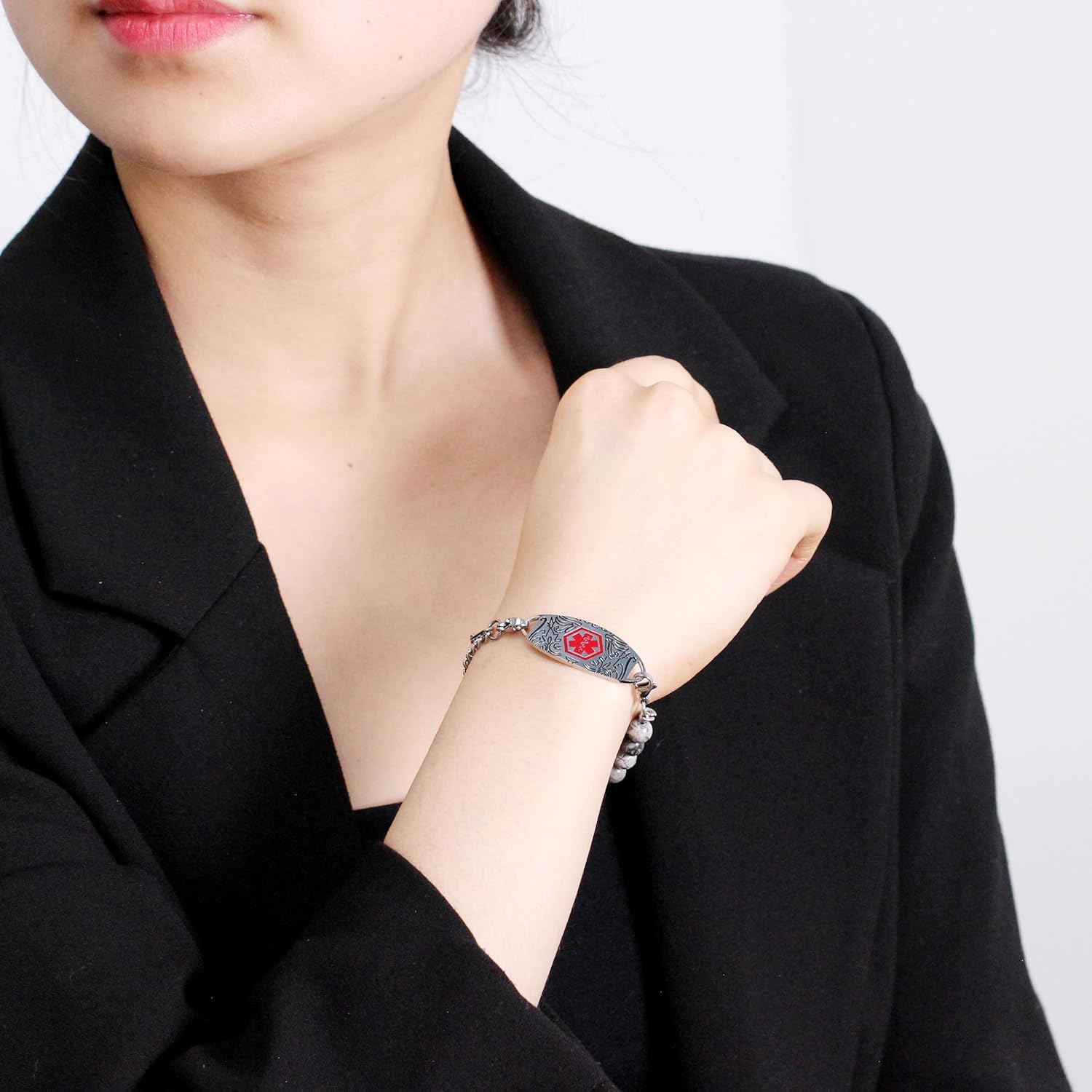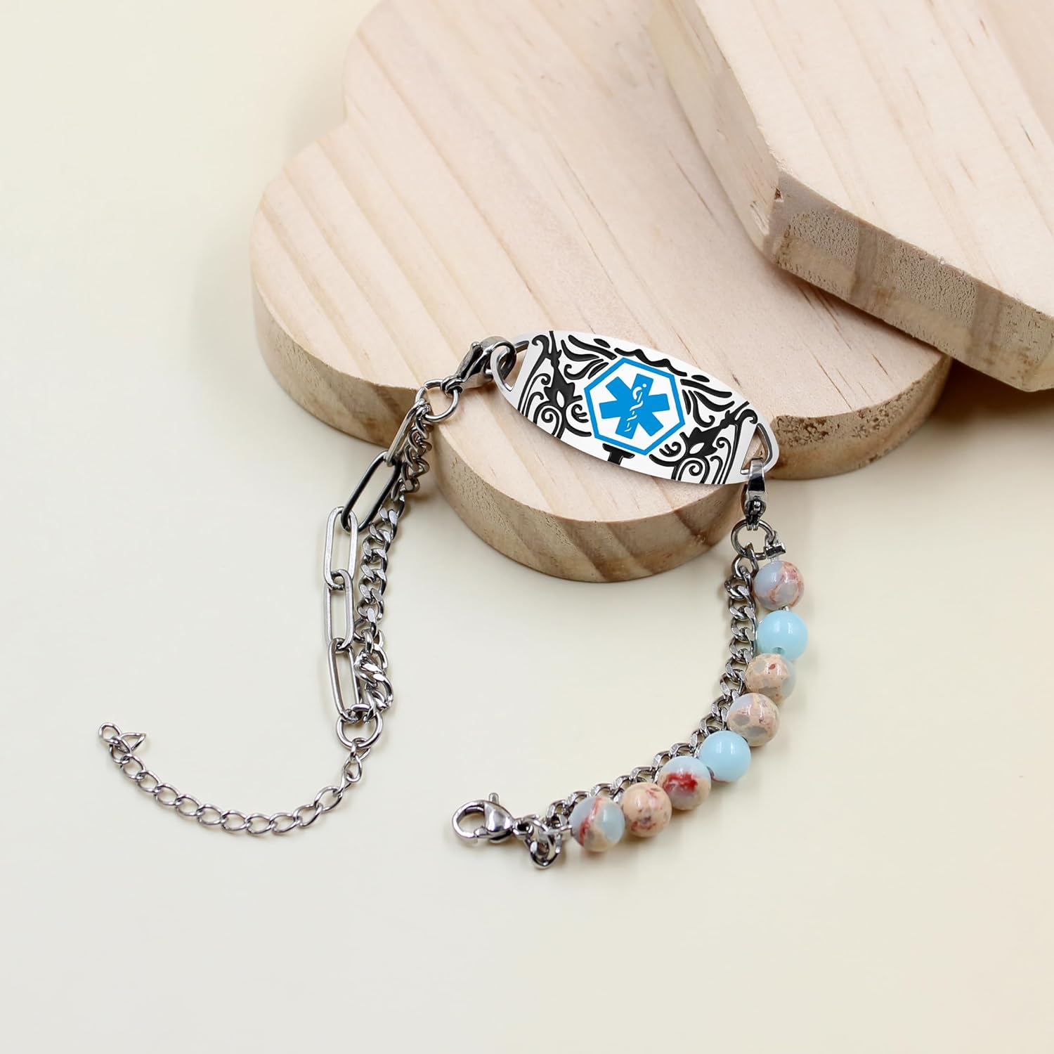 Customized Engraving Bracelet, Grey Map Jasper, Double-Strand Medical ID Jewelry, Interchangeable Lobster Clasp, Stainless Steel Medical Alert Tag, EMS Symbol Bracelet for Seniors, Caduceus Medical Emergency Jewelry, Allergy ID Tag, First Aid Wristband, 17–22cm, Health Card Included.