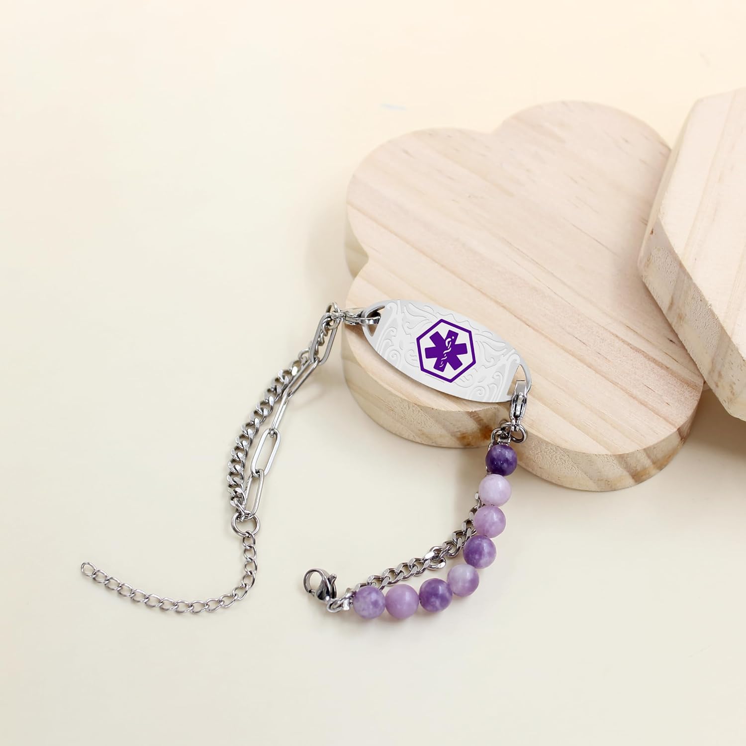 This medical alert bracelet features a refined double-strand design with Grey Map Jasper beads and a stainless steel engraved tag. Caduceus and Star of Life EMS symbols provide immediate emergency identification. The interchangeable lobster clasp allows users to swap or update ID plates with ease.