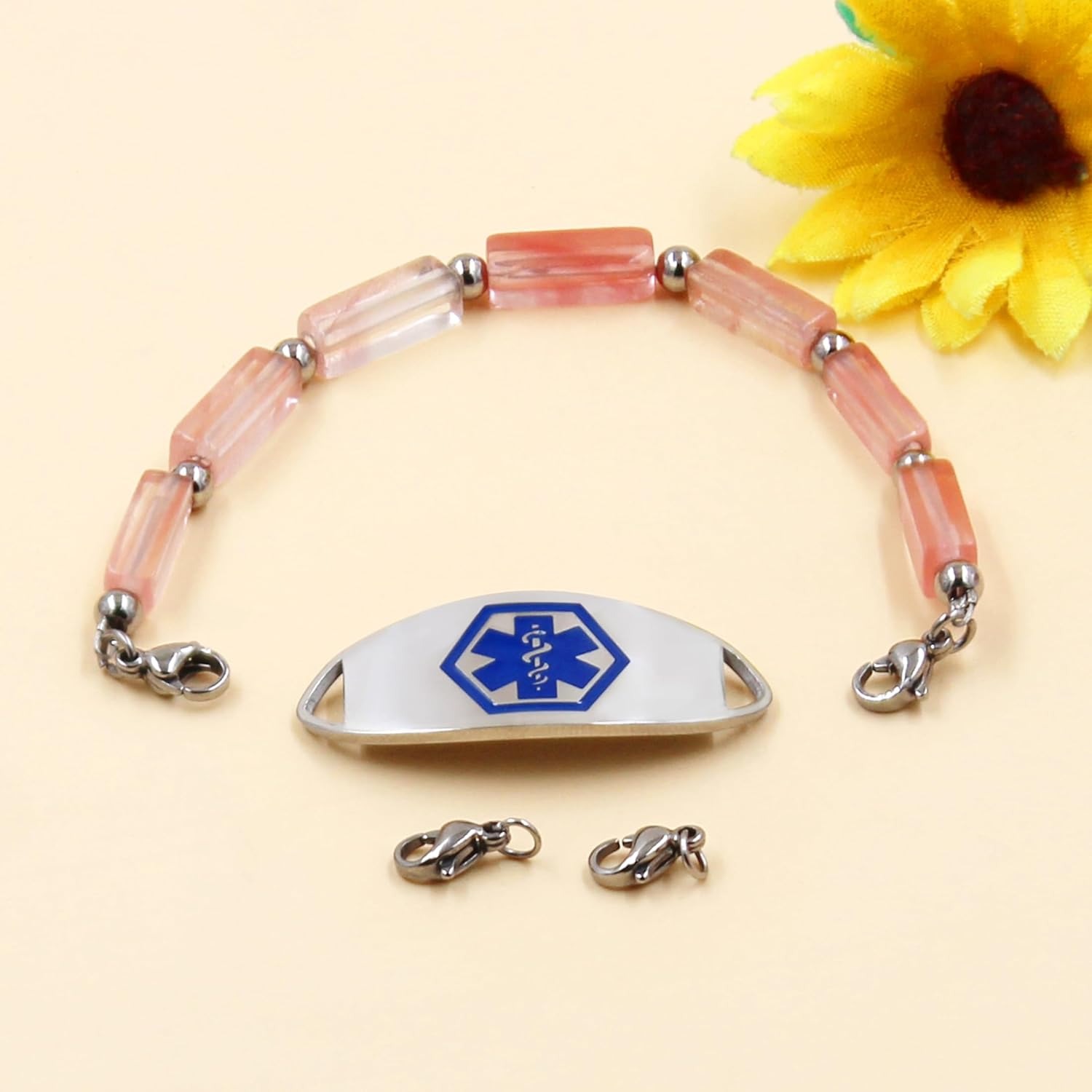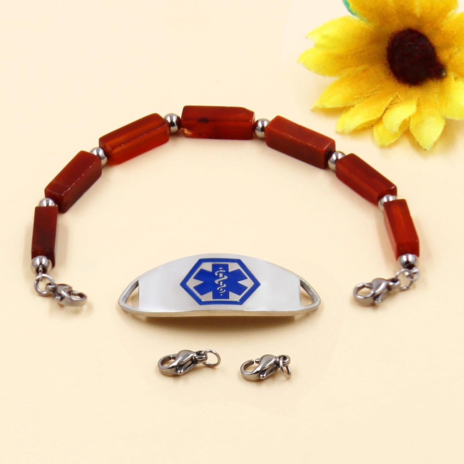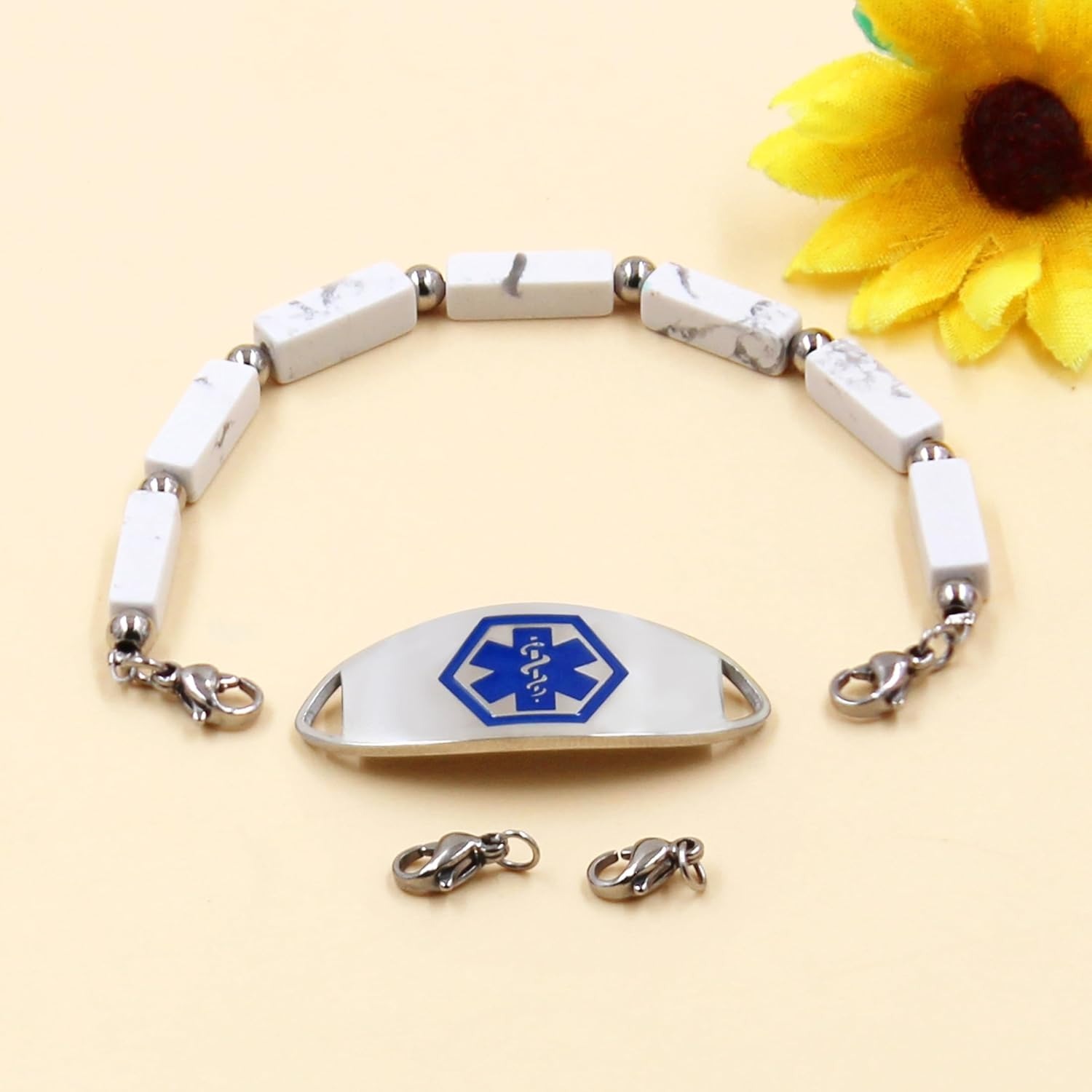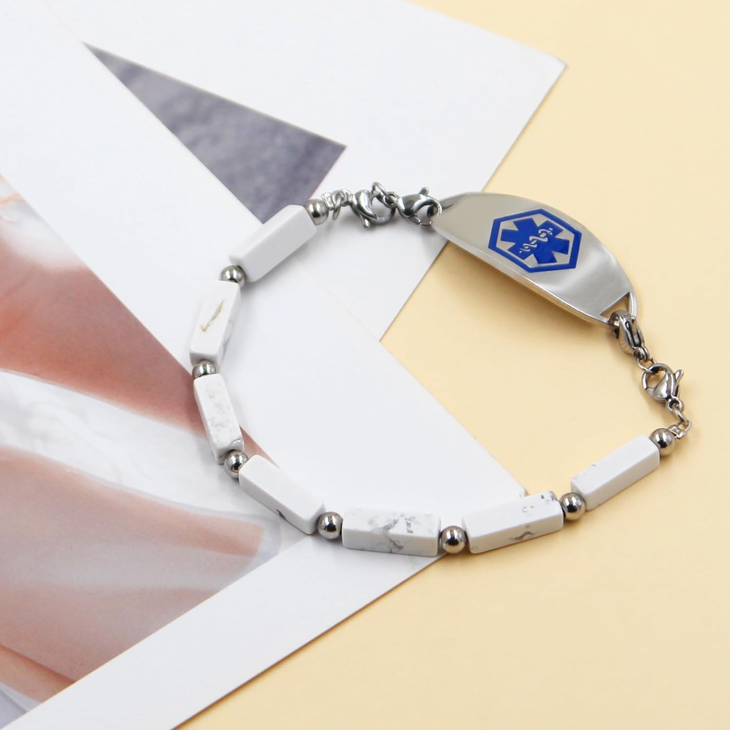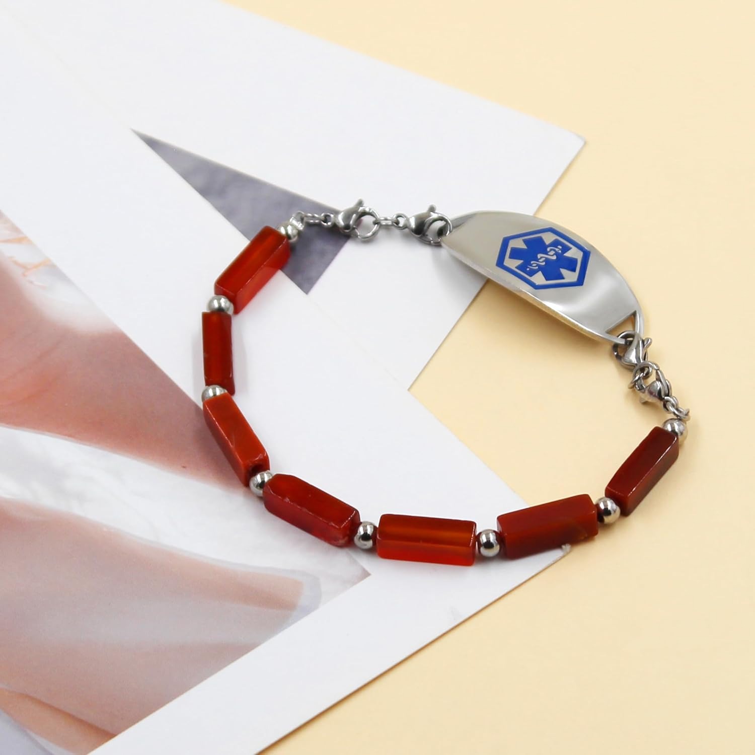 Dynamic QR Code Medical Alert Bracelet with Natural Stone Beads, Pink Stone Red Agate Black Agate White Turquoise, Stainless Steel Medical ID Bracelet, Double Lobster Clasp, No Engraving Required