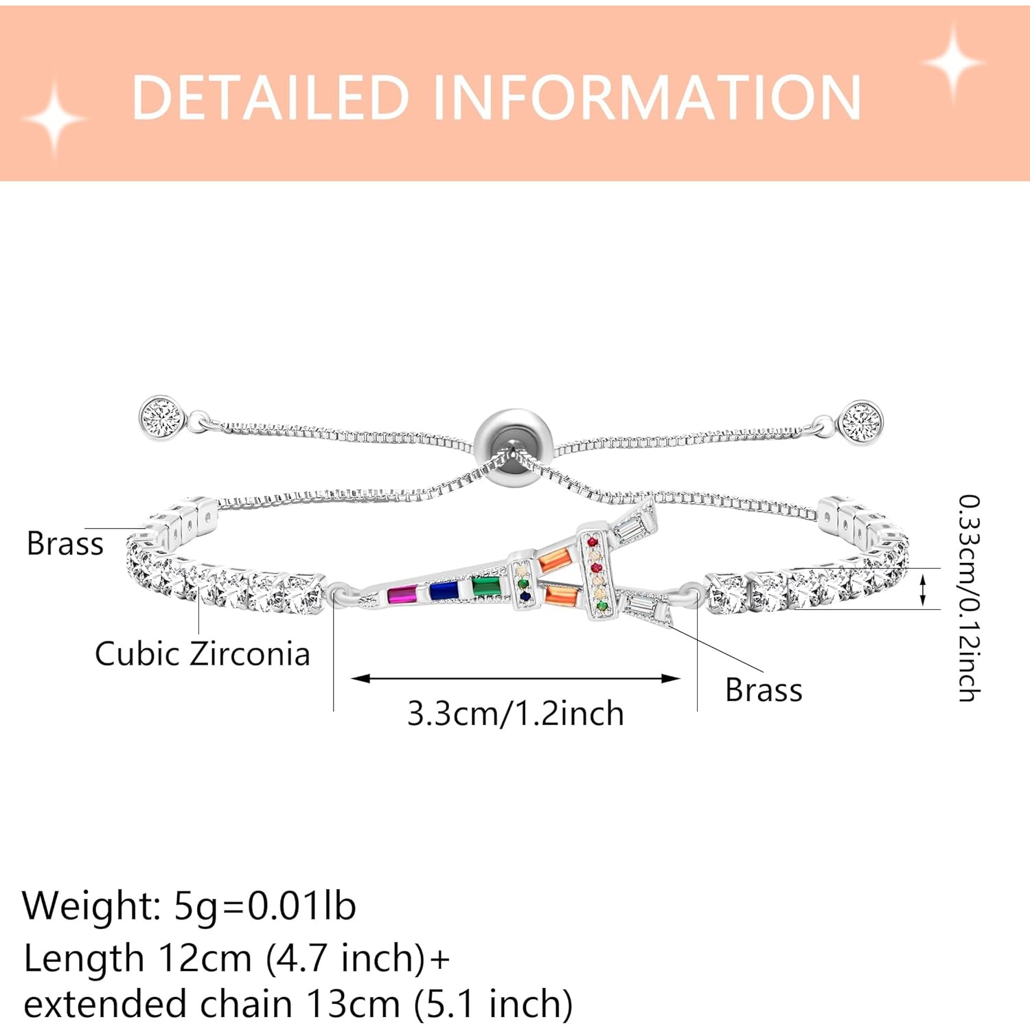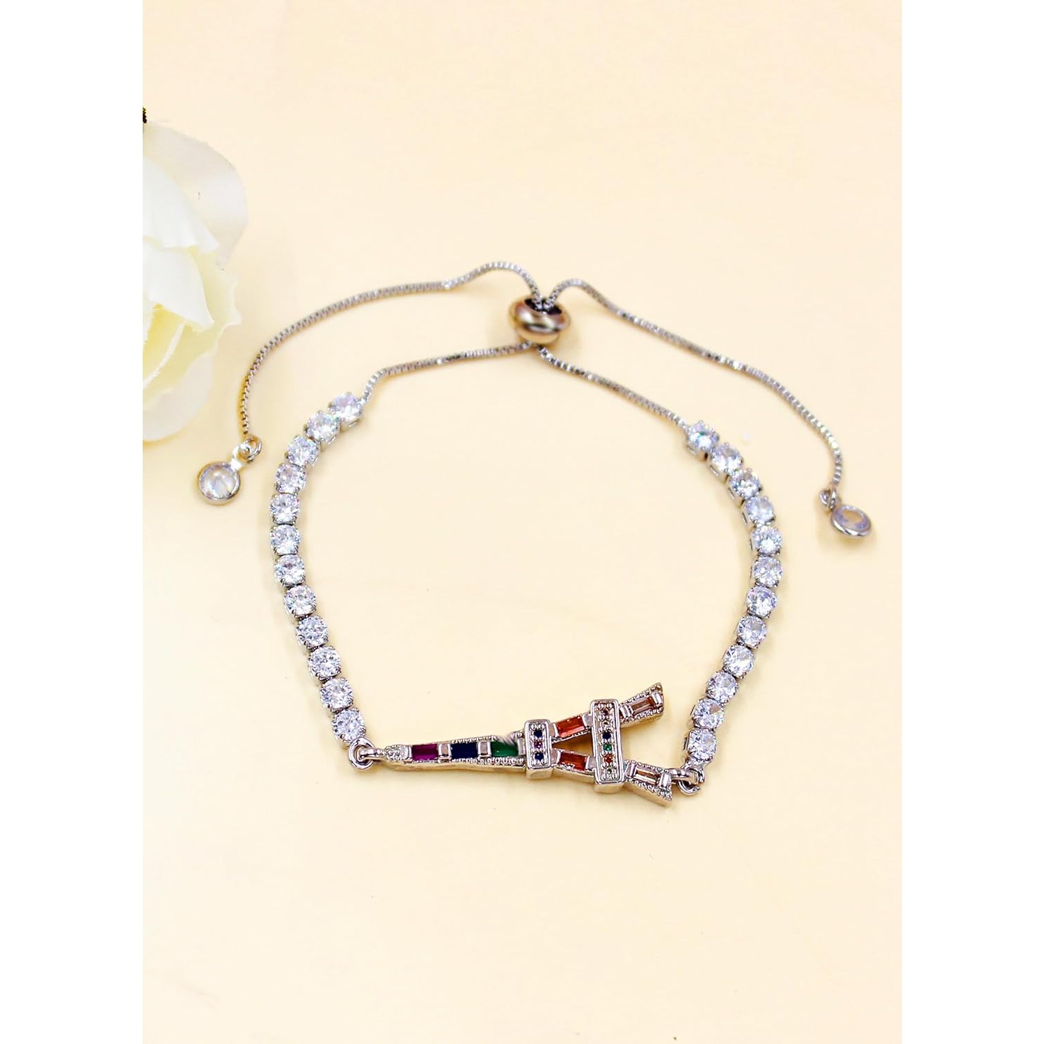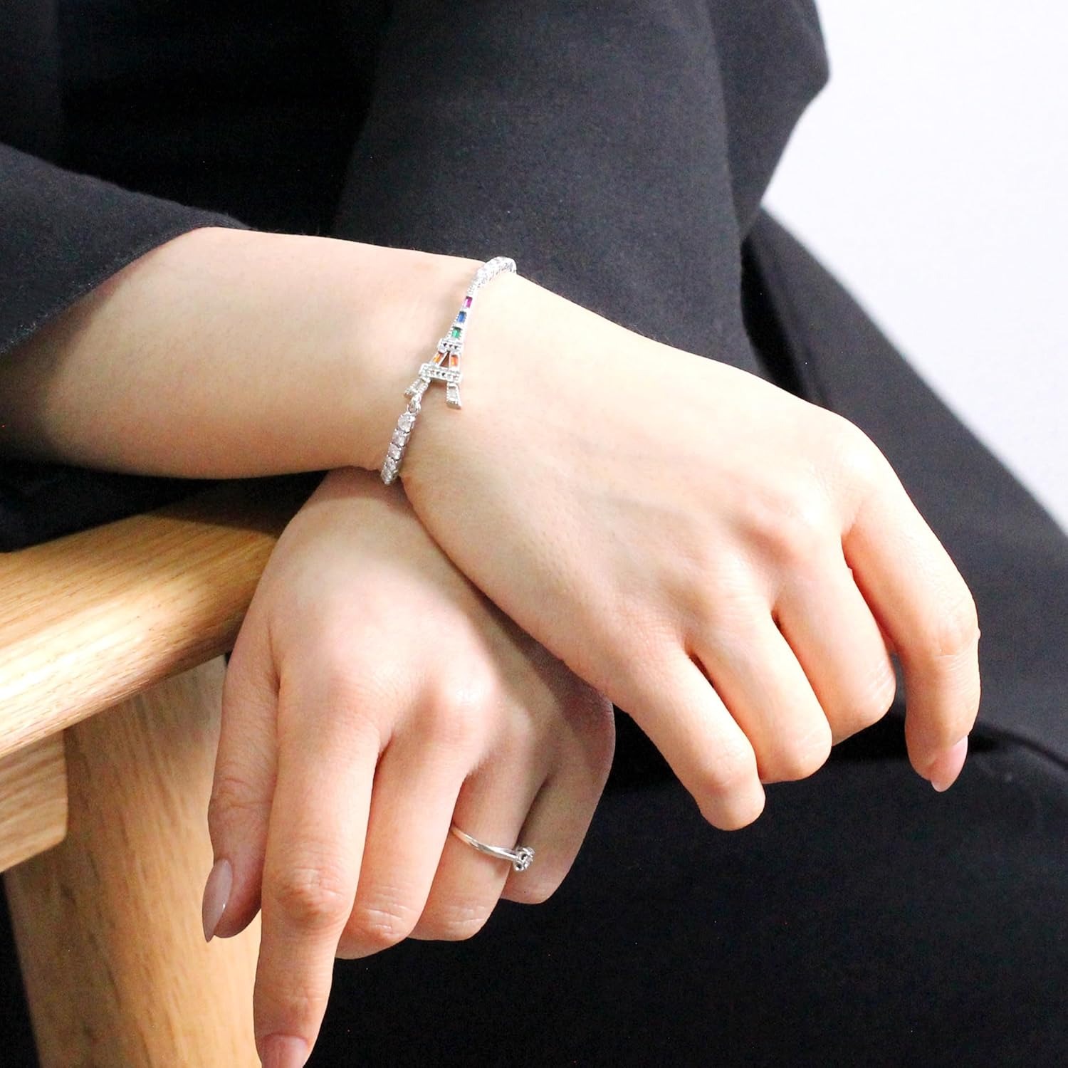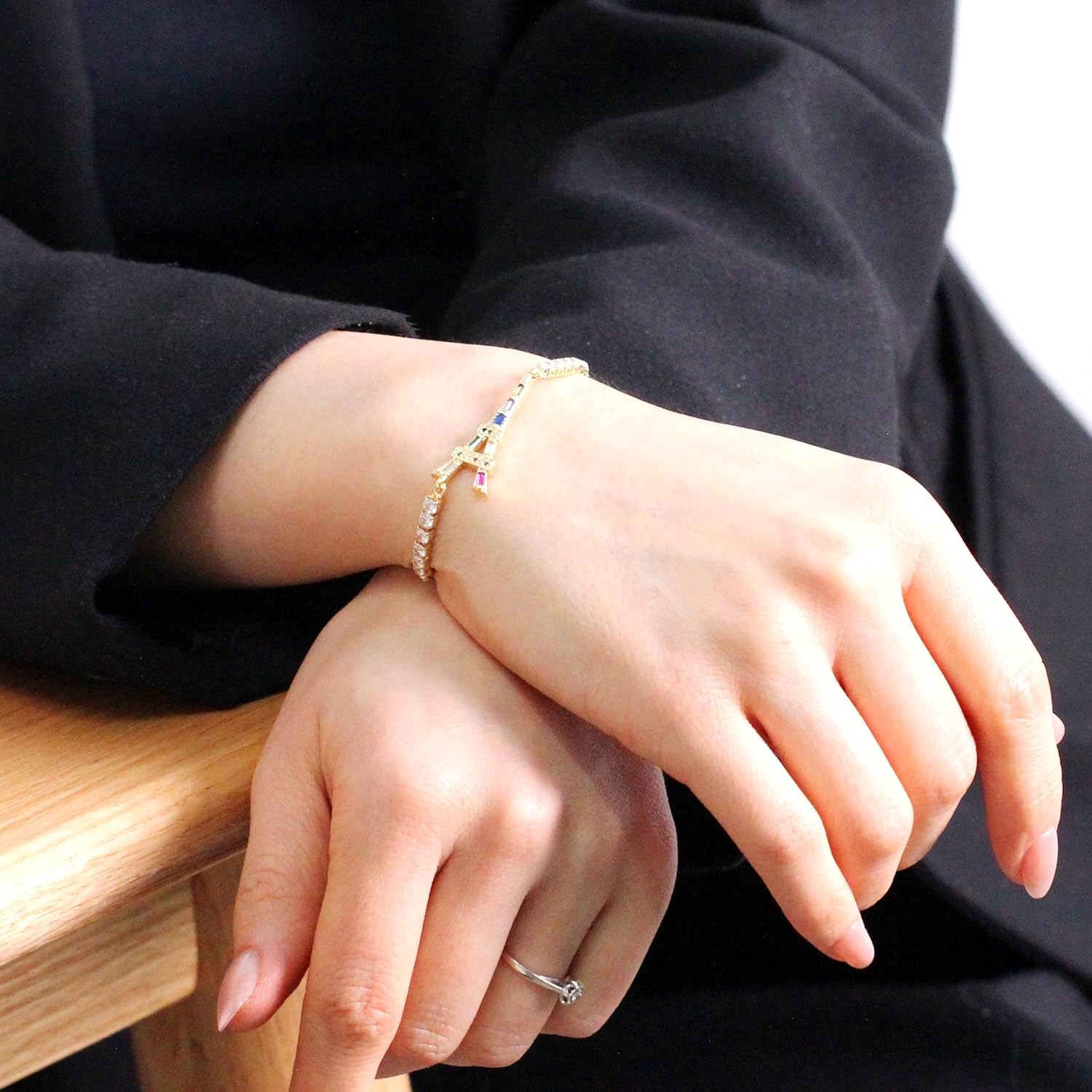 Inspired by the iconic Eiffel Tower, this elegant tennis bracelet captures the romance and charm of Paris. The refined Eiffel Tower charm is decorated with multicolor cubic zirconia, symbolizing love, travel, and timeless elegance.