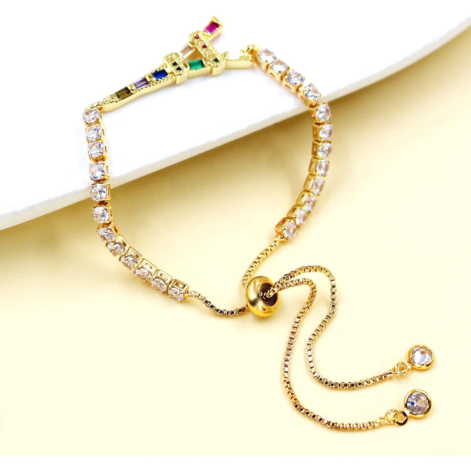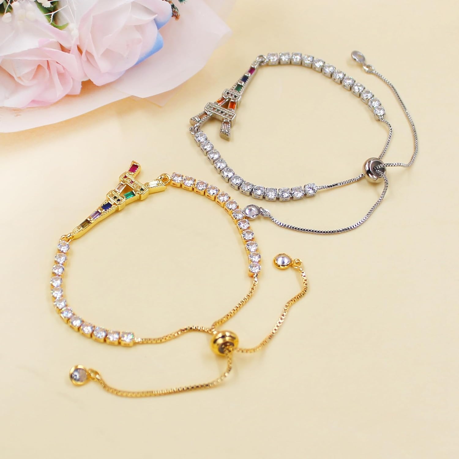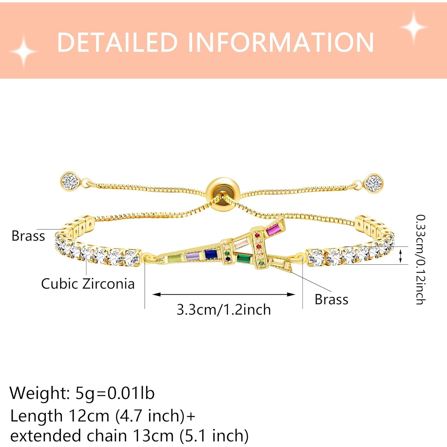 Elegant Eiffel Tower Tennis Bracelet with Multicolor CZ Charm, Golden Plated Adjustable Slider Chain Crystal Bracelet, Romantic Paris Jewelry Gift for Women Mom Daughter YA5691
