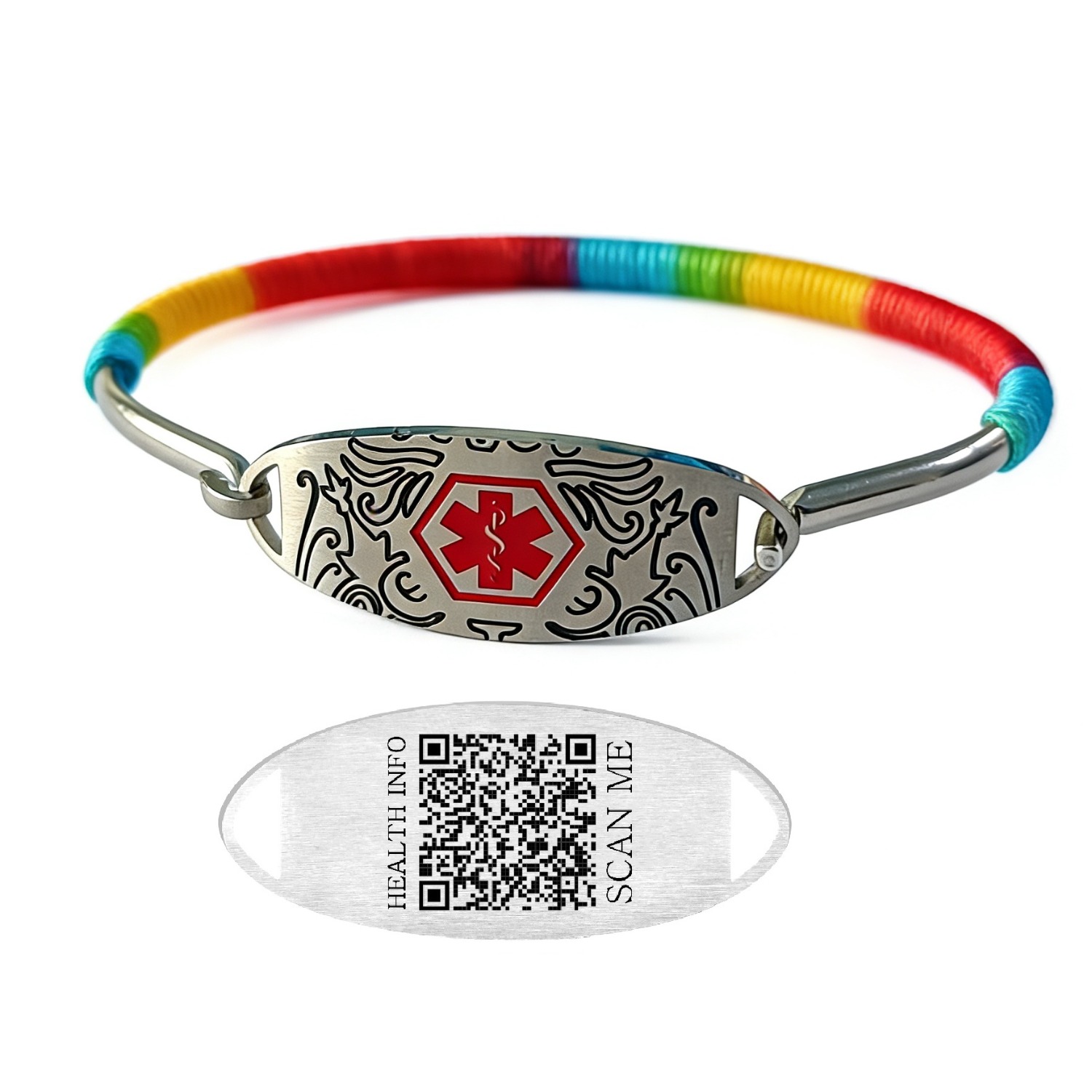 This medical alert bracelet features a fully editable dynamic QR code. Simply scan with your smartphone to add or update medical conditions, allergies, medications, and emergency contacts anytime.