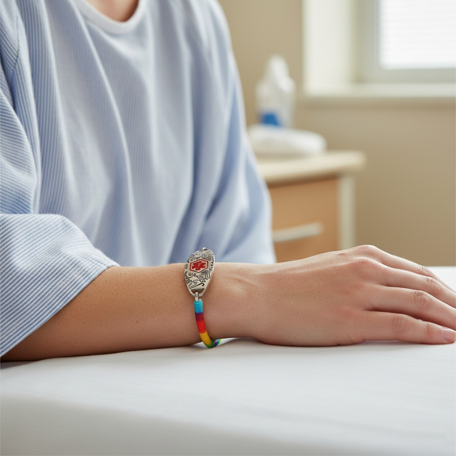 Features a bright red medical emblem for high visibility, helping first responders quickly recognize critical medical ID jewelry during emergencies.