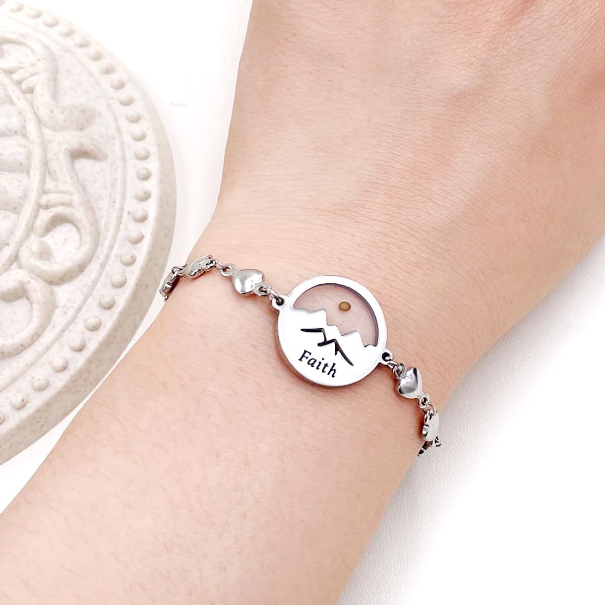 The bracelet features a minimalist round charm engraved with a mountain design and the word “Faith”, symbolizing strength, hope, and trust in God’s plan. A real mustard seed is delicately set into the charm, representing God’s promise and encouragement through every season of life.