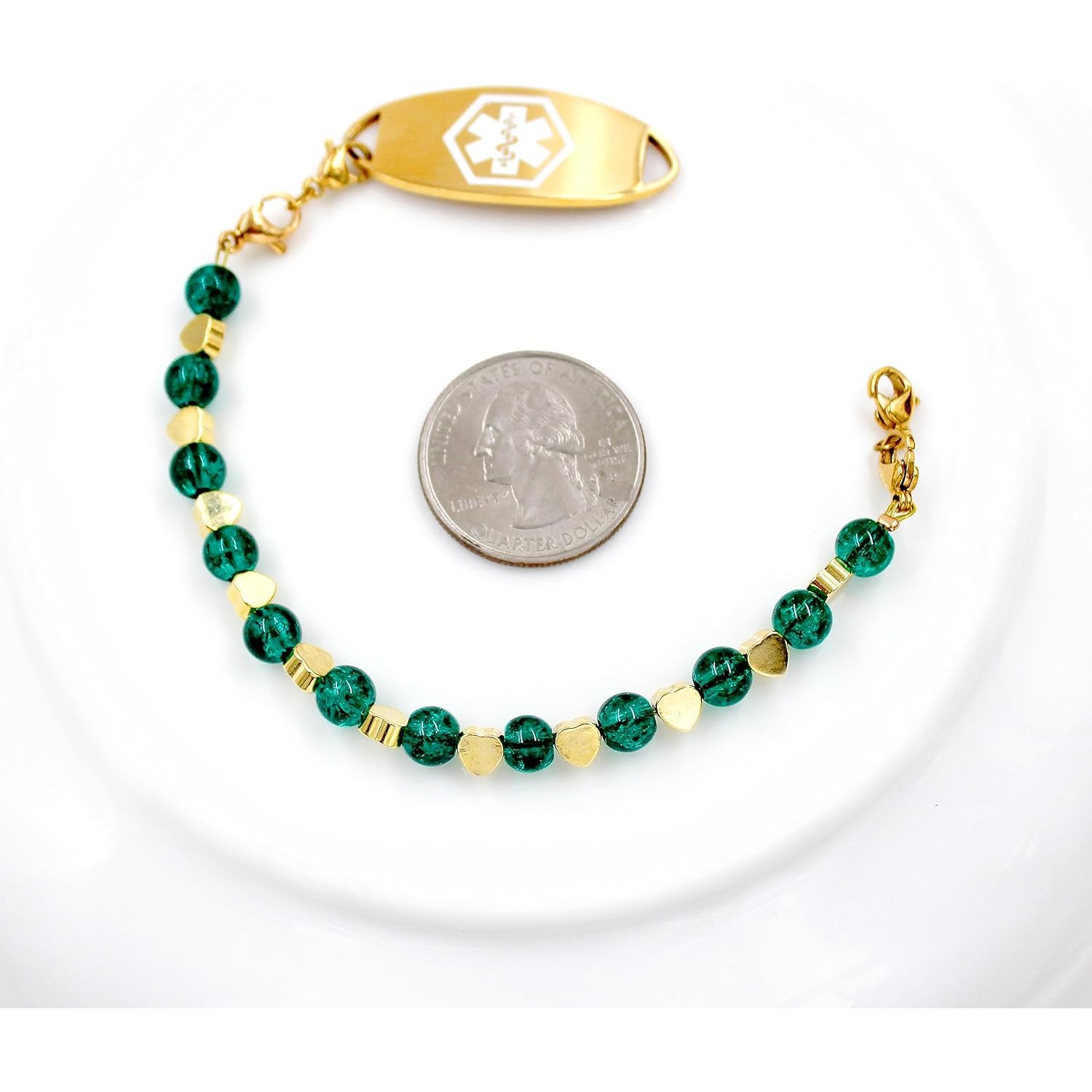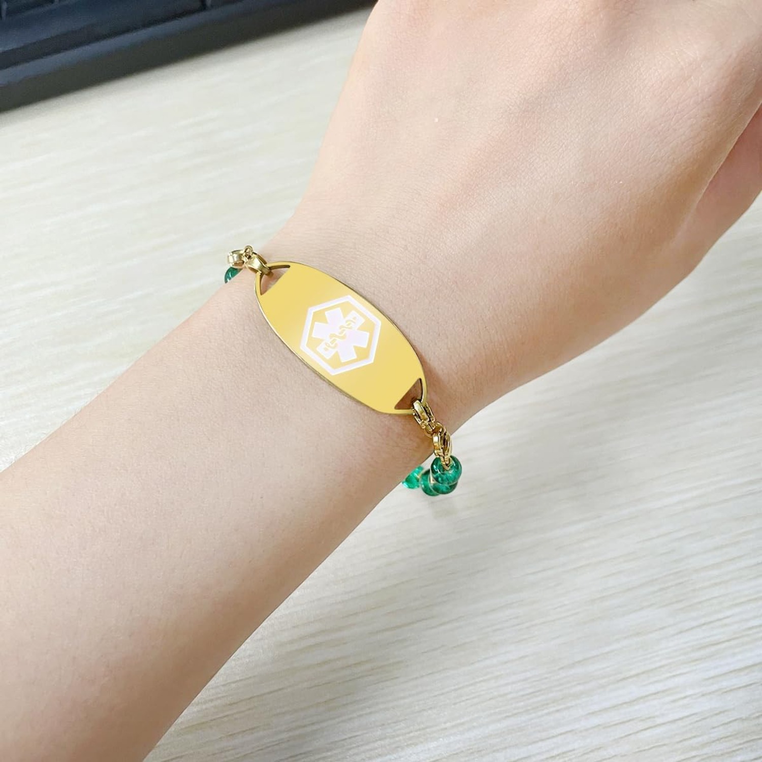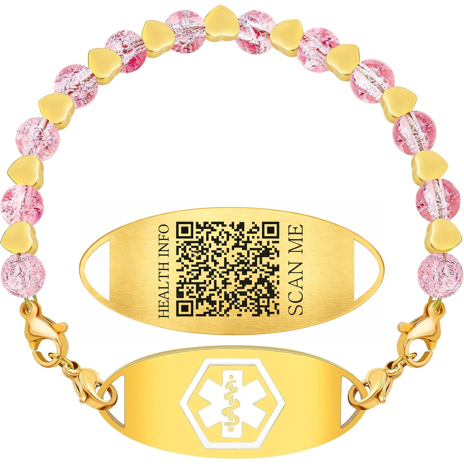 Stainless Steel Medical Alert Bracelet for Women 18K Gold Plated Tarnish Resistant | Laser Engraved or Dynamic QR Code ID Bracelet | Green Pink Purple Crack Bead Heart Adjustable Jewelry