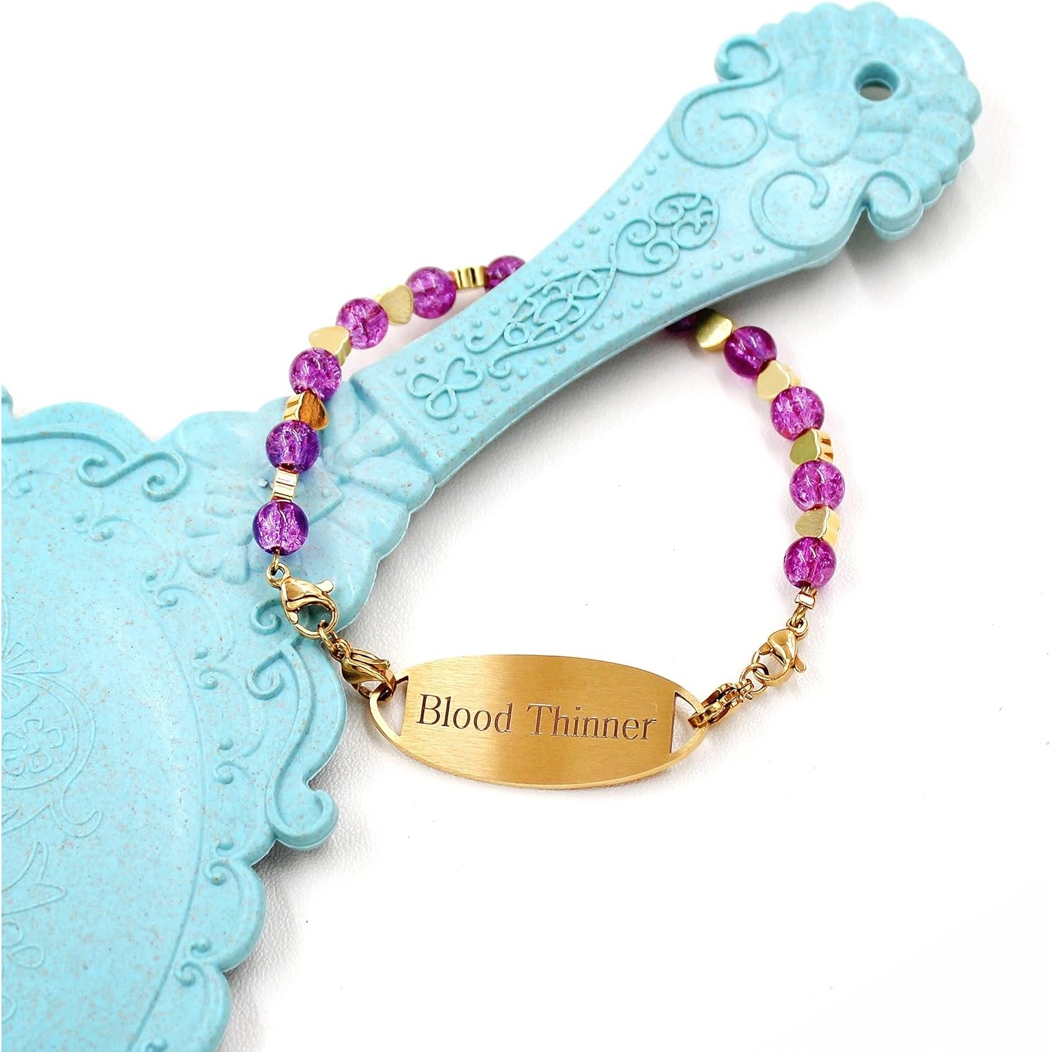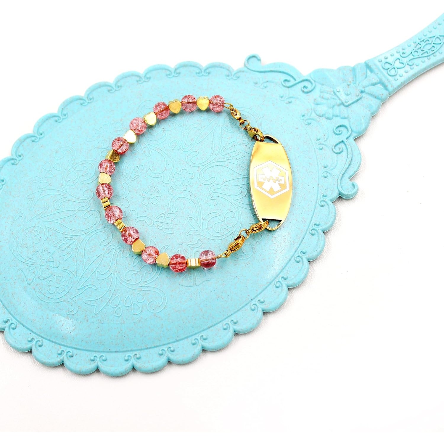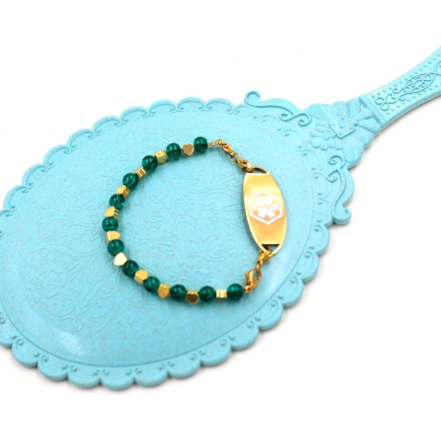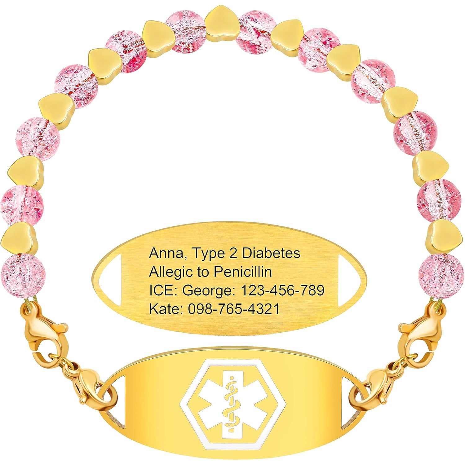 Stainless Steel Medical Alert Bracelet for Women 18K Gold Plated Tarnish Resistant | Laser Engraved or Dynamic QR Code ID Bracelet | Green Pink Purple Crack Bead Heart Adjustable Jewelry