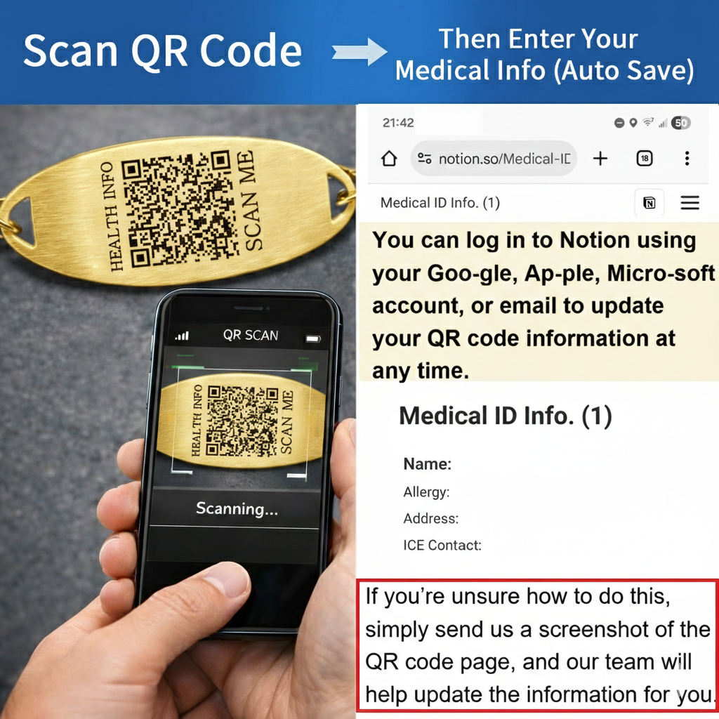 Choose permanent laser engraving or a fully editable dynamic QR code. Update medical information anytime without replacing the bracelet.
