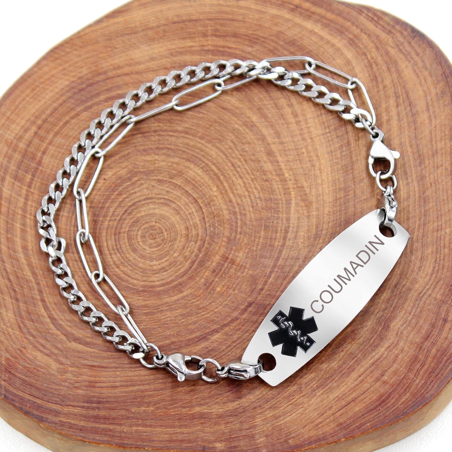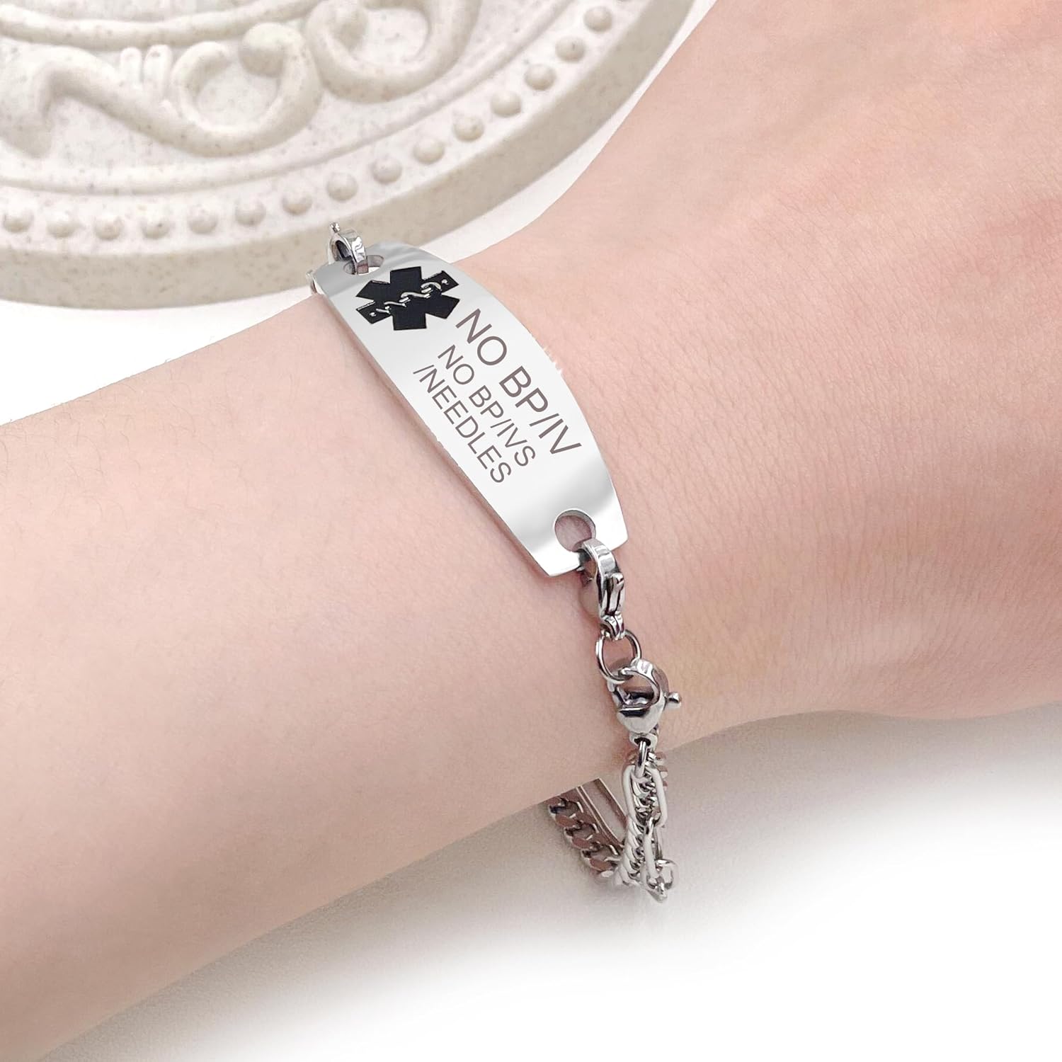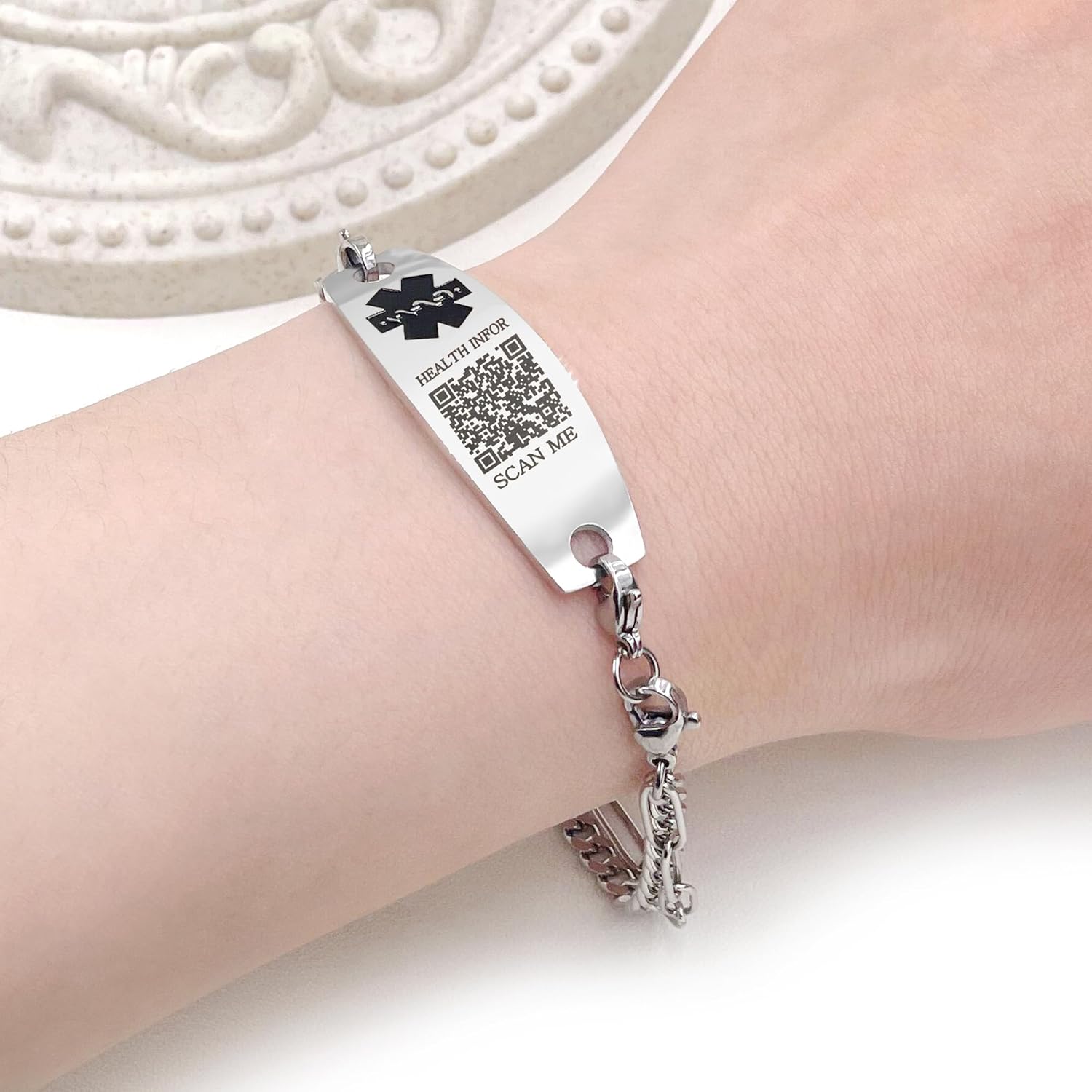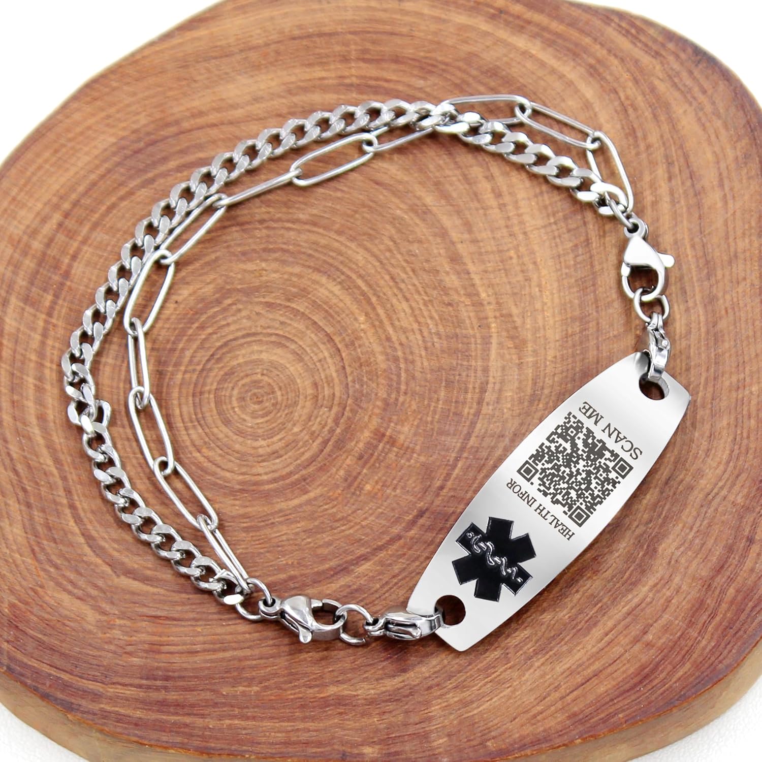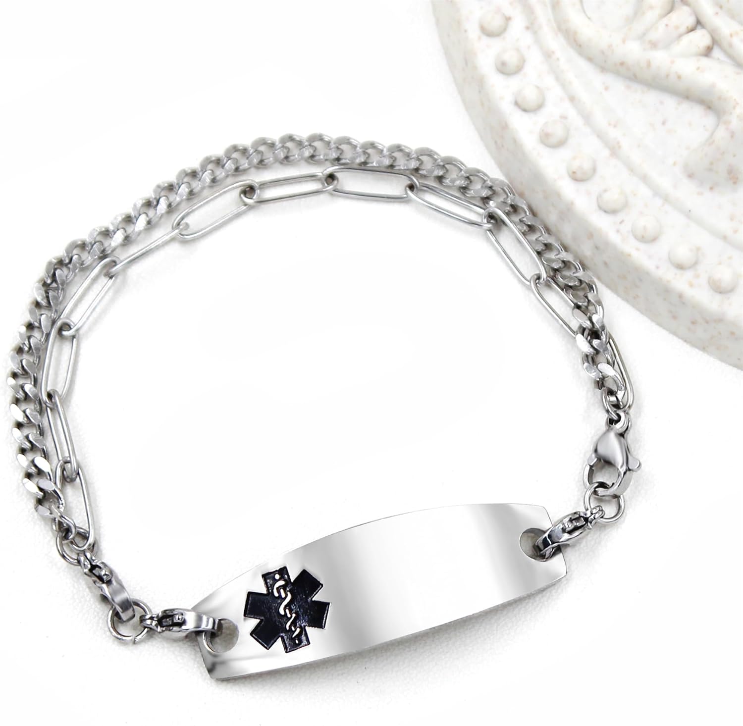 6. Key Words: Medical ID bracelet, medical alert bracelet, stainless steel medical bracelet, custom engraved bracelet, emergency ID bracelet, waterproof medical bracelet, personalized medical bracelet, interchangeable medical alert bracelet, men's medical alert bracelet, women's medical alert bracelet, adjustable medical bracelet, double-chain medical bracelet, black medical bracelet, hypoallergenic bracelet, distress response jewelry, emergency medical bracelet.
