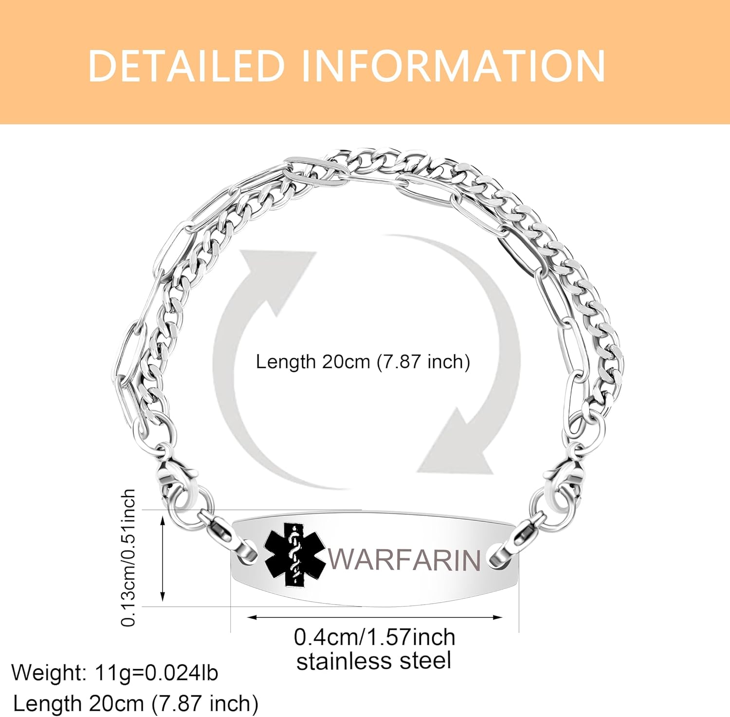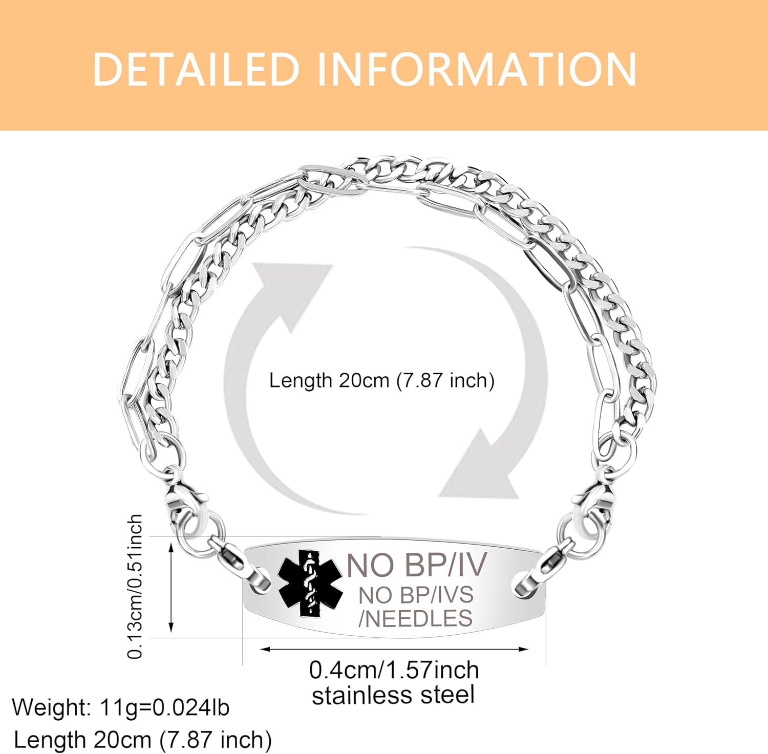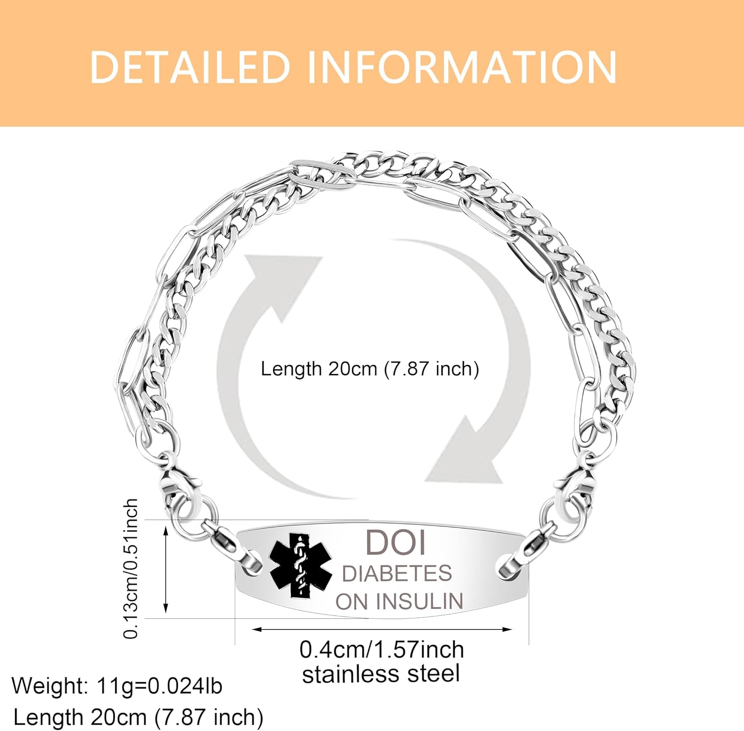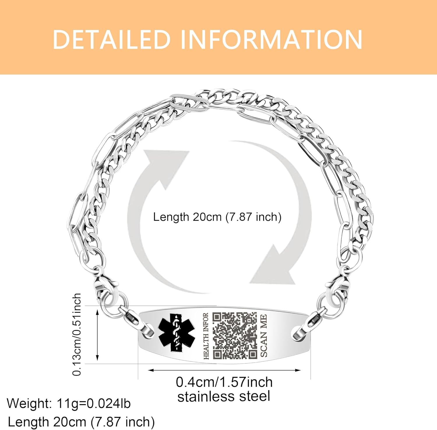 3. Size: This medical alert bracelet is designed with an adjustable length of 18cm (7") + 5cm (2"), providing a comfortable fit for most wrist sizes.