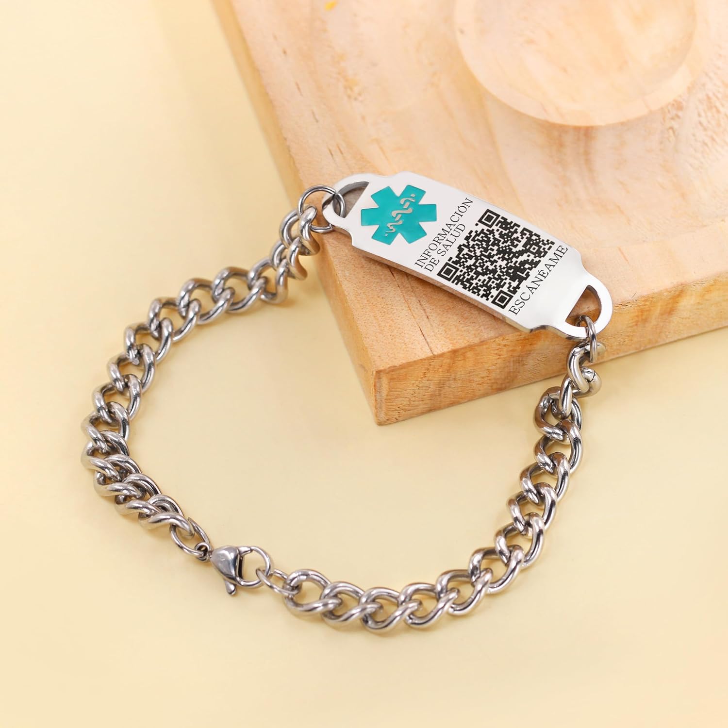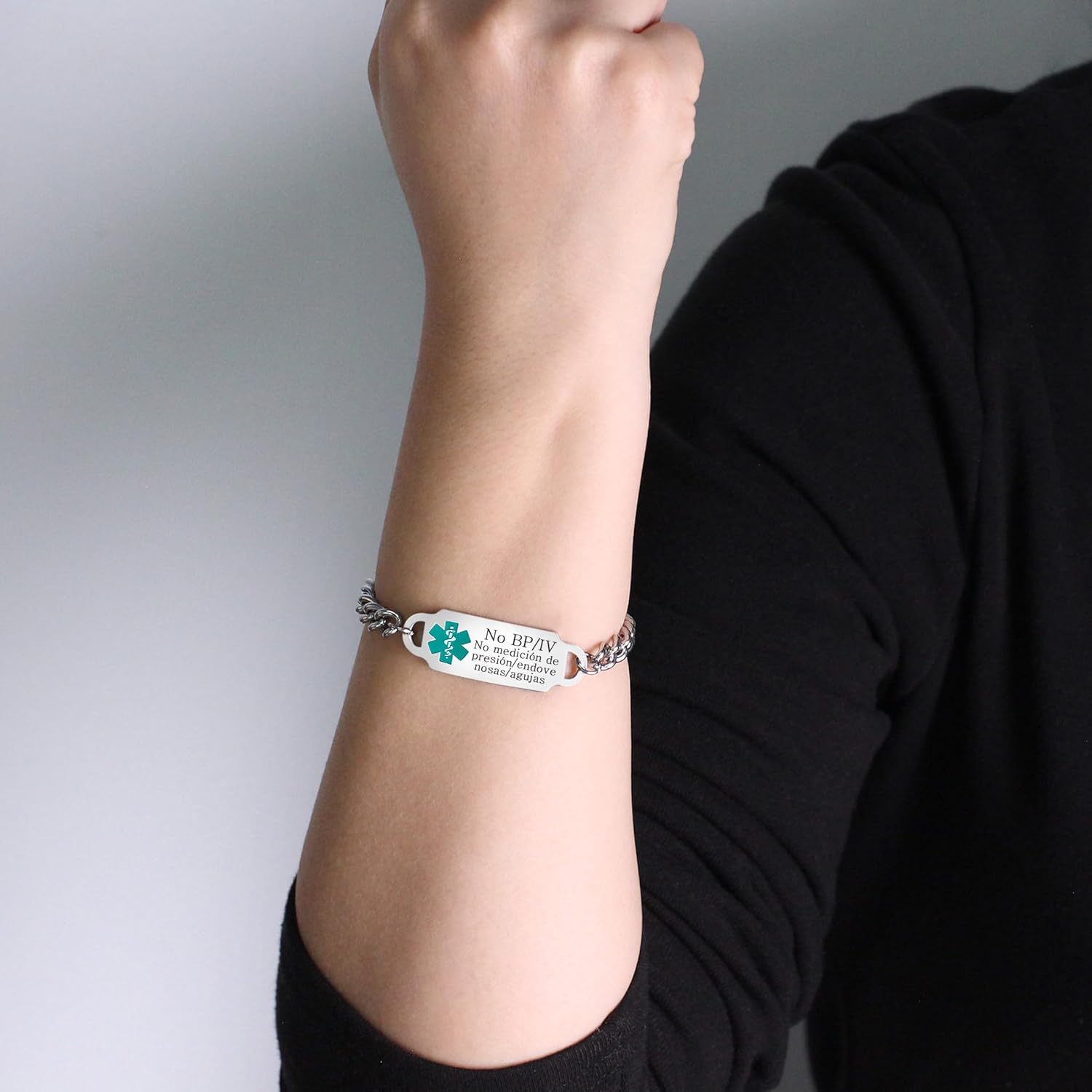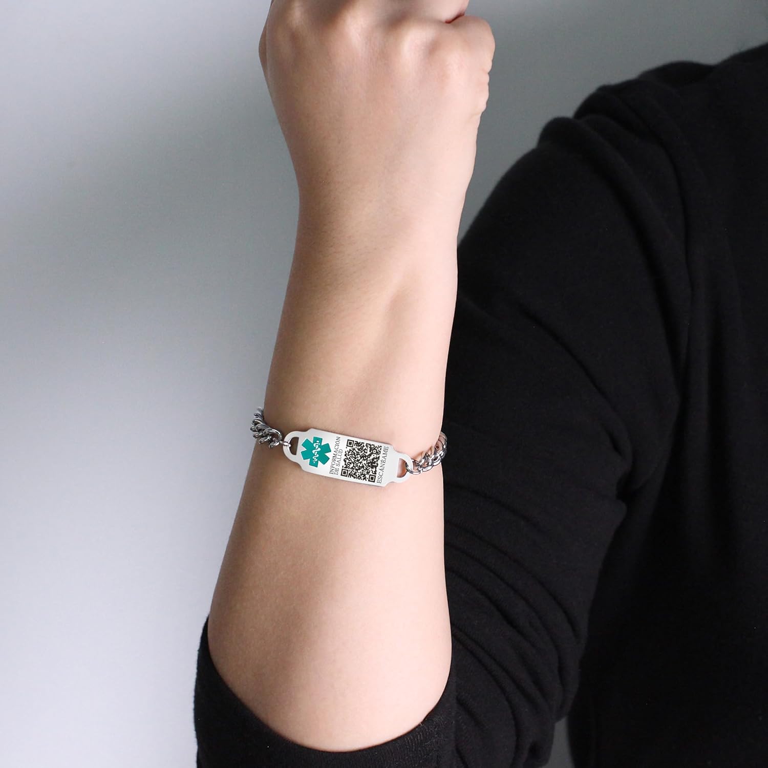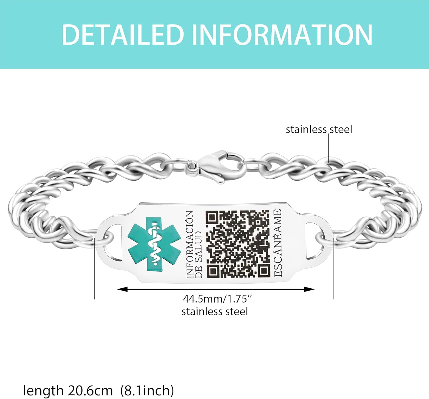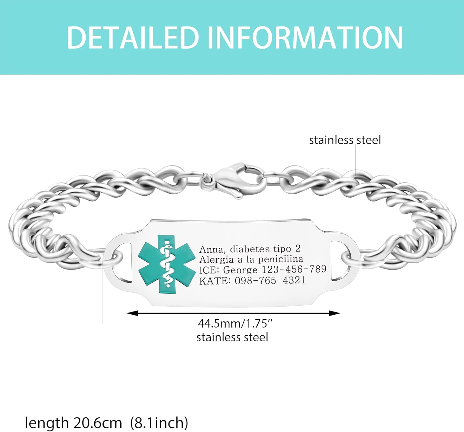 2.Material: Crafted from hypoallergenic stainless steel, this medical ID bracelet is resistant to corrosion and tarnishing. Its durable, smooth surface is gentle on sensitive skin, ensuring long-lasting comfort without irritation. Perfect for those with active or sensitive skin.