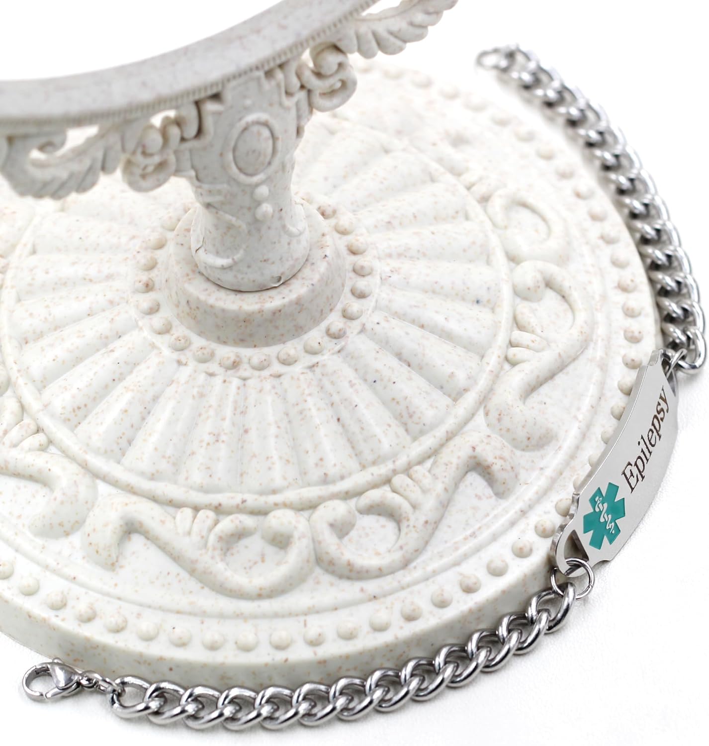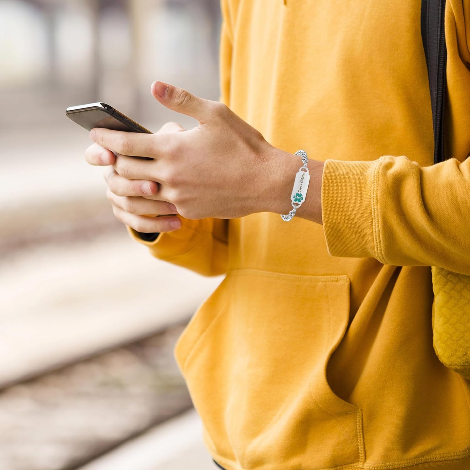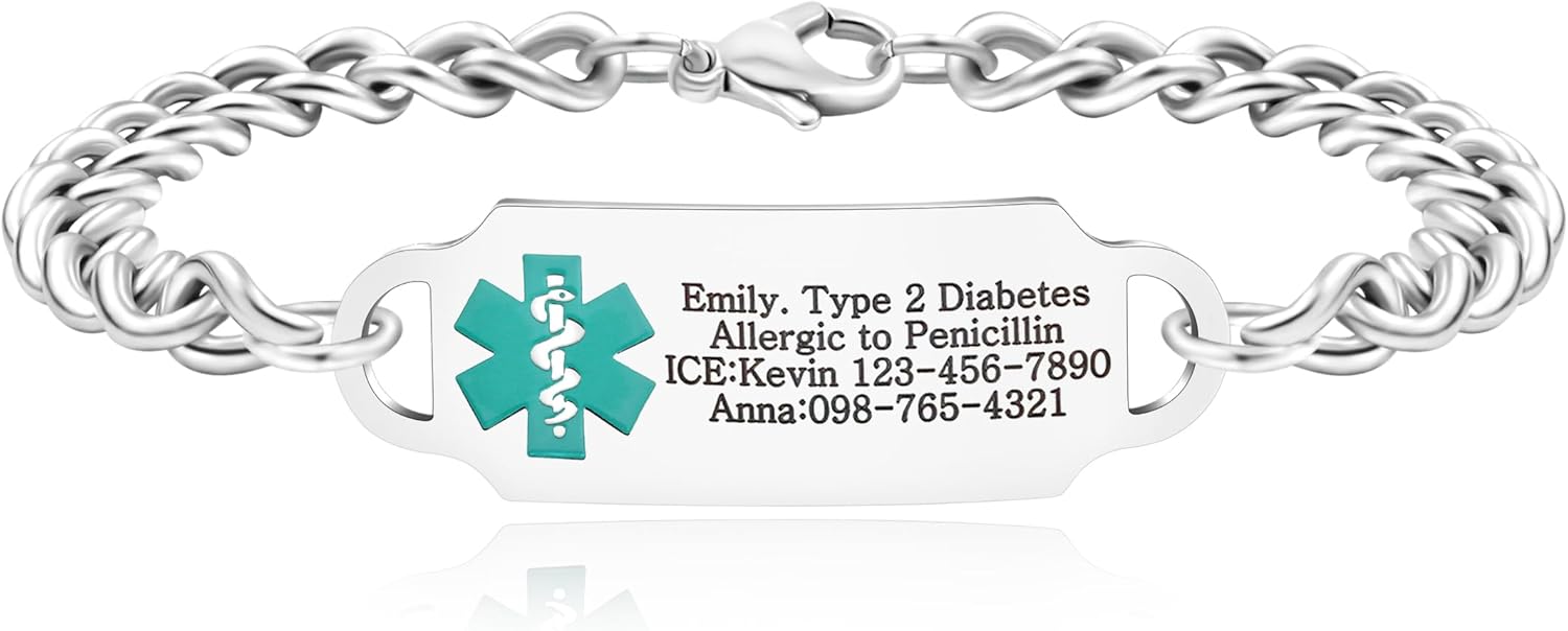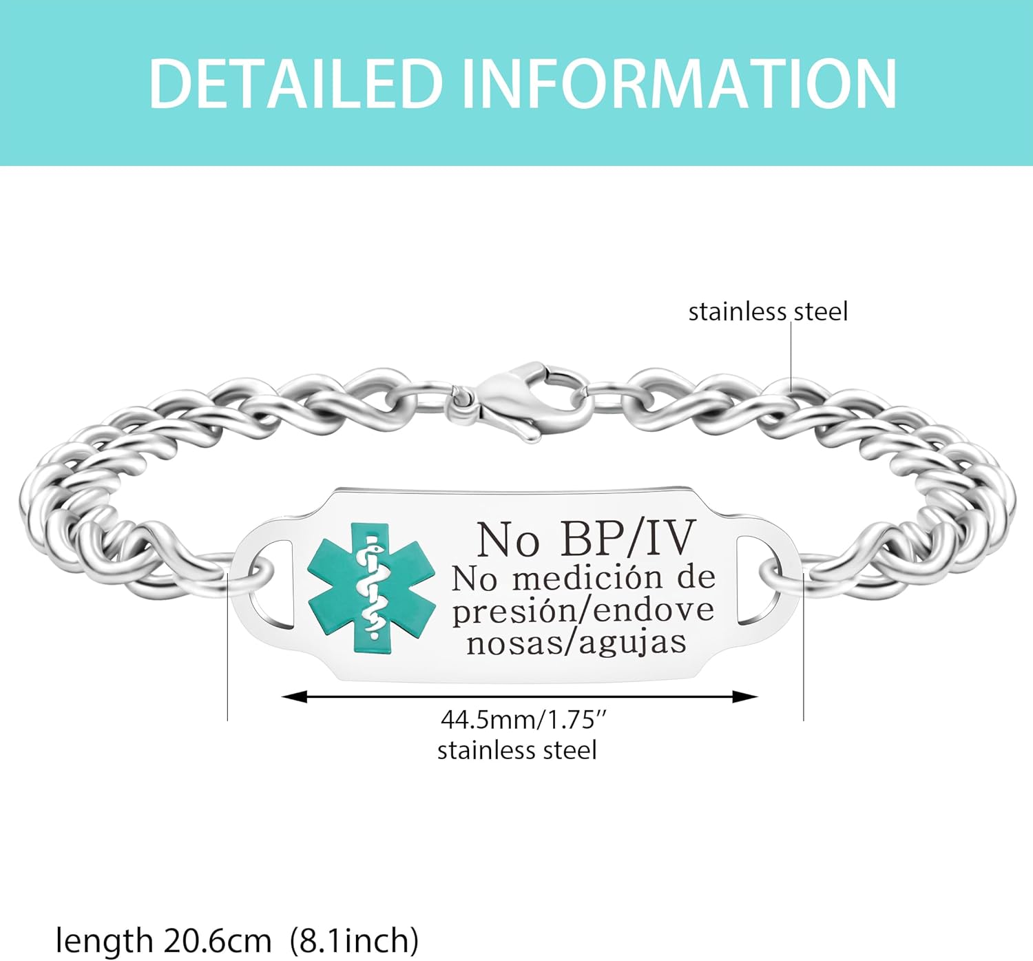 2.Material: Crafted from hypoallergenic stainless steel, this medical ID bracelet is resistant to corrosion and tarnishing. Its durable, smooth surface is gentle on sensitive skin, ensuring long-lasting comfort without irritation. Perfect for those with active or sensitive skin.