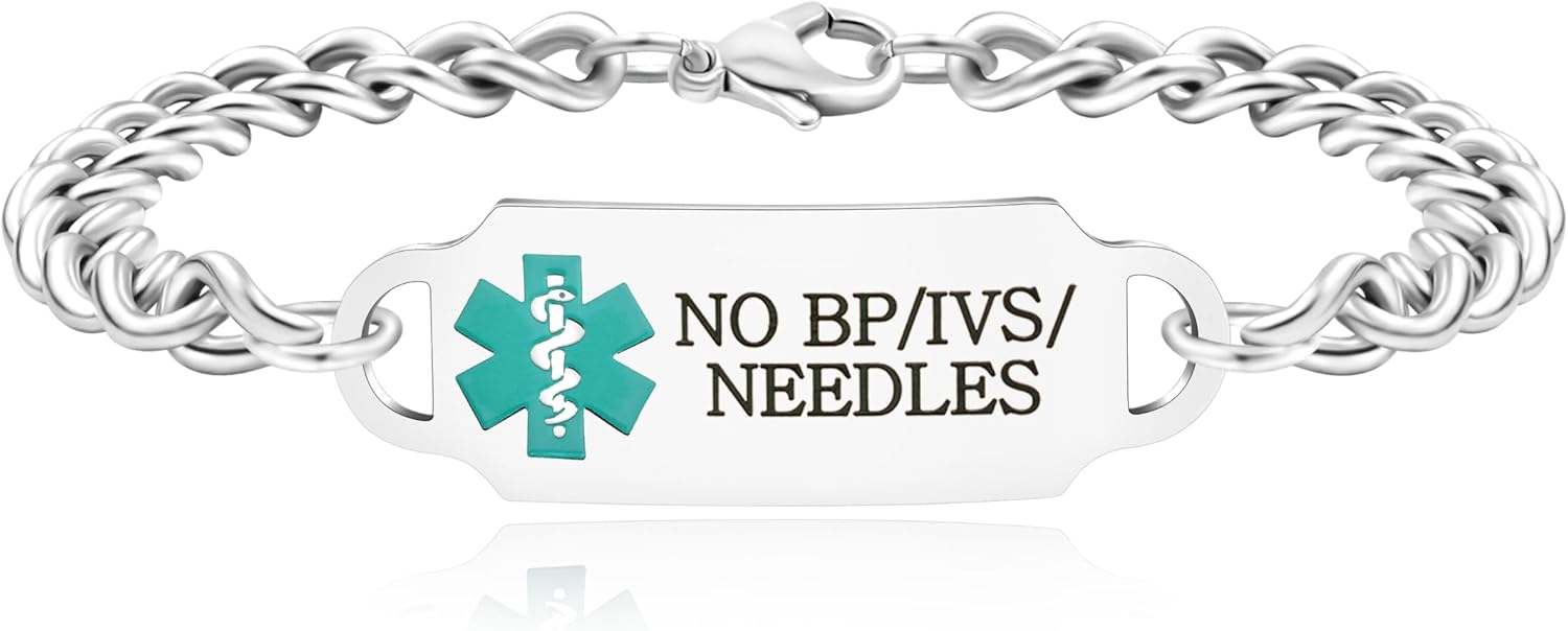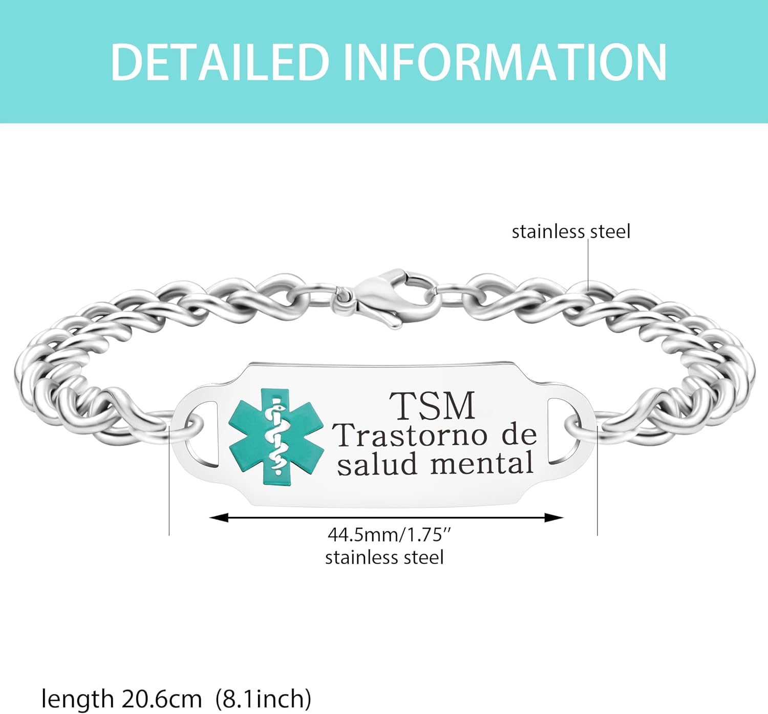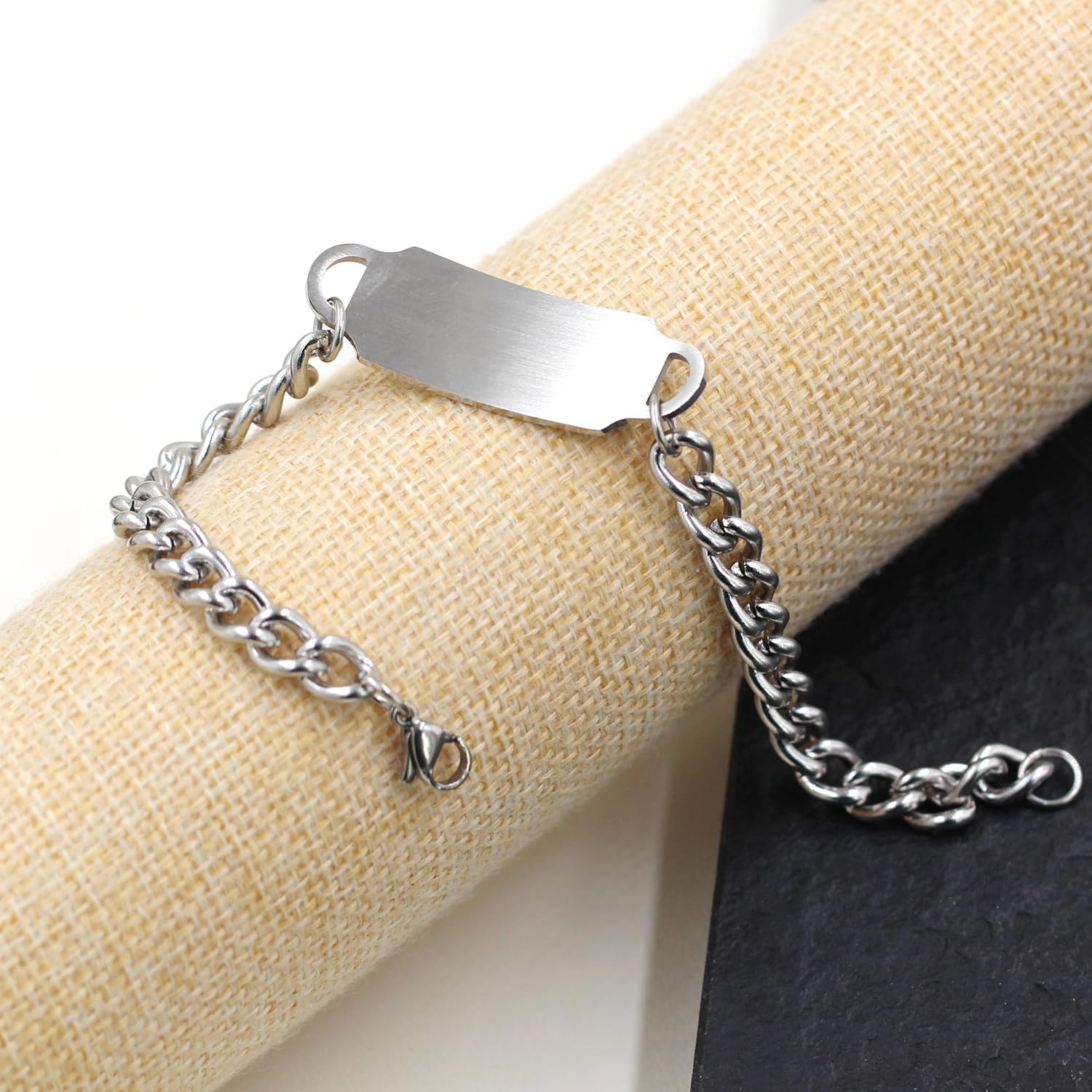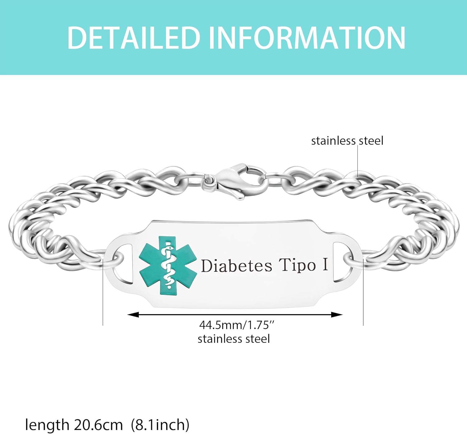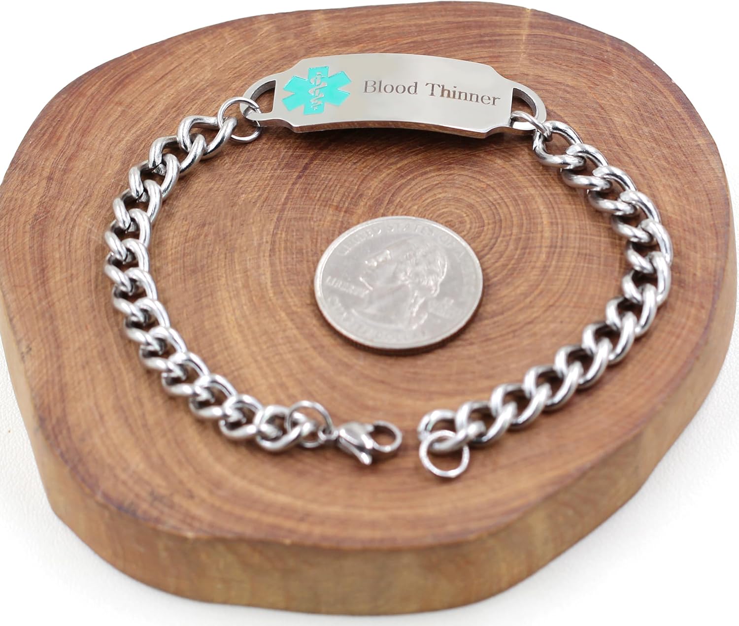 2.Material: Crafted from hypoallergenic stainless steel, this medical ID bracelet is resistant to corrosion and tarnishing. Its durable, smooth surface is gentle on sensitive skin, ensuring long-lasting comfort without irritation. Perfect for those with active or sensitive skin.